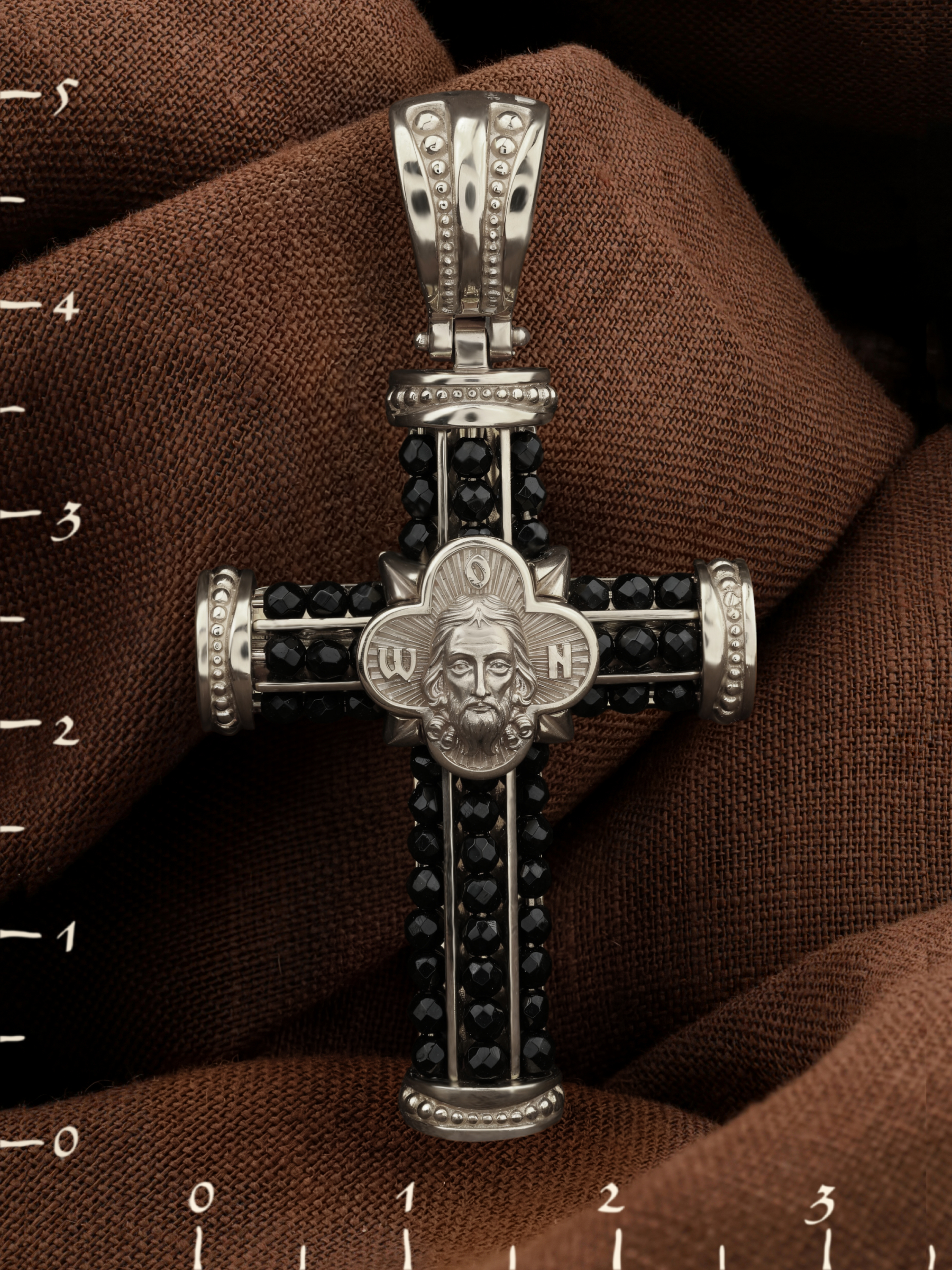 В центральной части лицевой стороны креста изображен Спас Нерукотворный — образ Господа и Спасителя нашего Иисуса Христа, чудесно отпечатавшийся на плате, котором Христос вытер свой лик. Согласно Преданию, изложенному в Четьи Минее, Авгарь V Ухама, больной проказой, послал ко Христу своего архивария Ханнана (Ананию) с письмо, в котором просил Христа прийти в Едессу и исцелить его. Ханнан же был художником, и Авгарь поручил ему, если Спаситель не сможет прийти, то написать хотя бы Его образ и принести ему. Видя, что Ханнан хочет сделать Его портрет, Христос потребовал воды, умылся, вытер Свой лик платом, и на этом плате отпечатался Его образ. Спаситель передал этот плат Ханнану с повелением отнести с ответным письмом пославшему его. Получив портрет, Авгарь исцелился от главного своего недуга, но лицо его оставалось еще поврежденным. После Пятидесятницы в Едессу пошёл святой апостол Фаддей, один из 70-ти, закончил исцеление Авгаря и обратил его в христианство. Авгарь прикрепил образ к доске и поместил в нише над городскими воротами, убрав оттуда находившегося там идола.