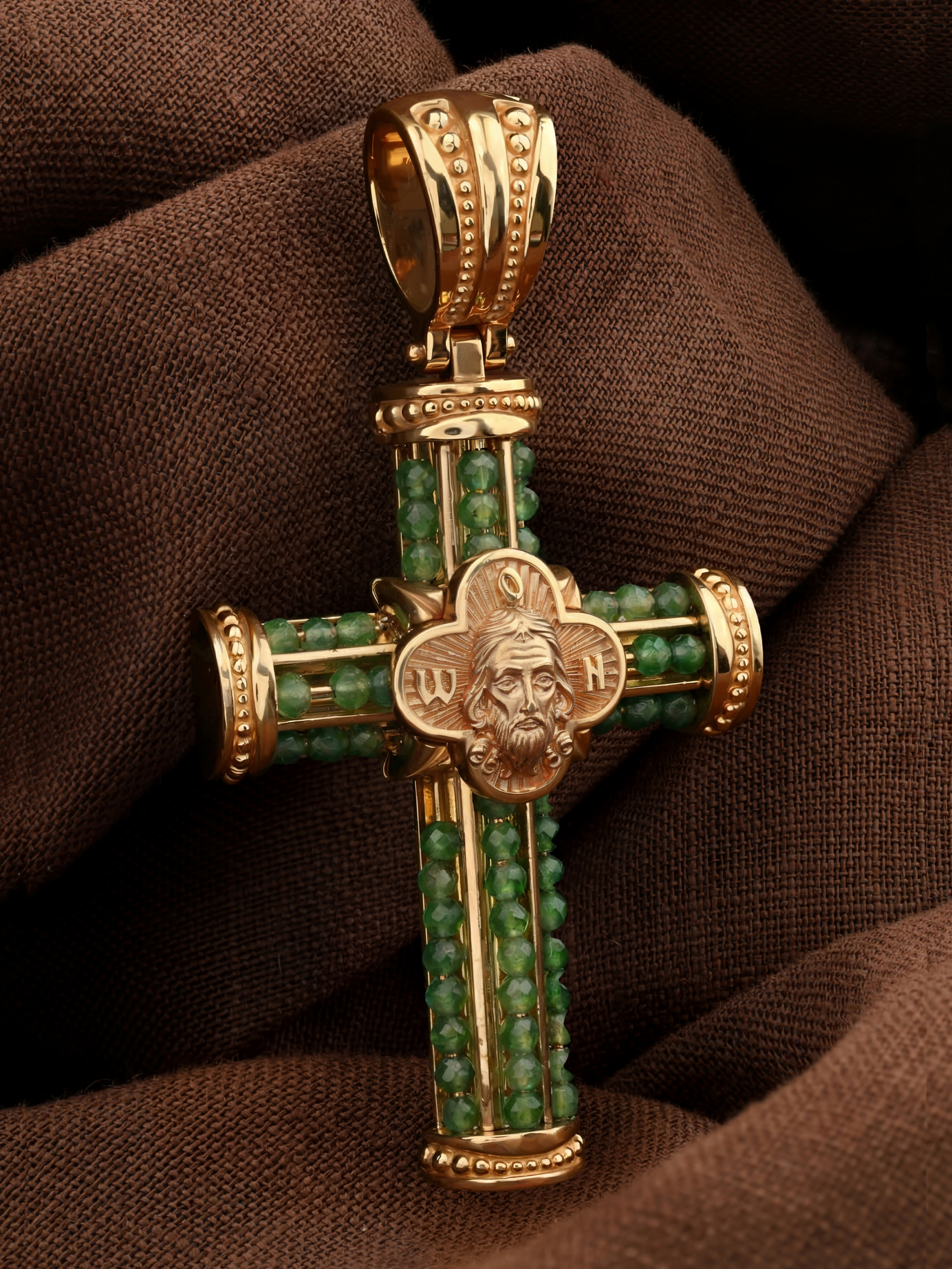 В центральной части лицевой стороны креста изображен Спас Нерукотворный — образ Господа и Спасителя нашего Иисуса Христа, чудесно отпечатавшийся на плате, котором Христос вытер свой лик. Согласно Преданию, изложенному в Четьи Минее, Авгарь V Ухама, больной проказой, послал ко Христу своего архивария Ханнана (Ананию) с письмо, в котором просил Христа прийти в Едессу и исцелить его. Ханнан же был художником, и Авгарь поручил ему, если Спаситель не сможет прийти, то написать хотя бы Его образ и принести ему. Видя, что Ханнан хочет сделать Его портрет, Христос потребовал воды, умылся, вытер Свой лик платом, и на этом плате отпечатался Его образ. Спаситель передал этот плат Ханнану с повелением отнести с ответным письмом пославшему его. Получив портрет, Авгарь исцелился от главного своего недуга, но лицо его оставалось еще поврежденным. После Пятидесятницы в Едессу пошёл святой апостол Фаддей, один из 70-ти, закончил исцеление Авгаря и обратил его в христианство. Авгарь прикрепил образ к доске и поместил в нише над городскими воротами, убрав оттуда находившегося там идола.