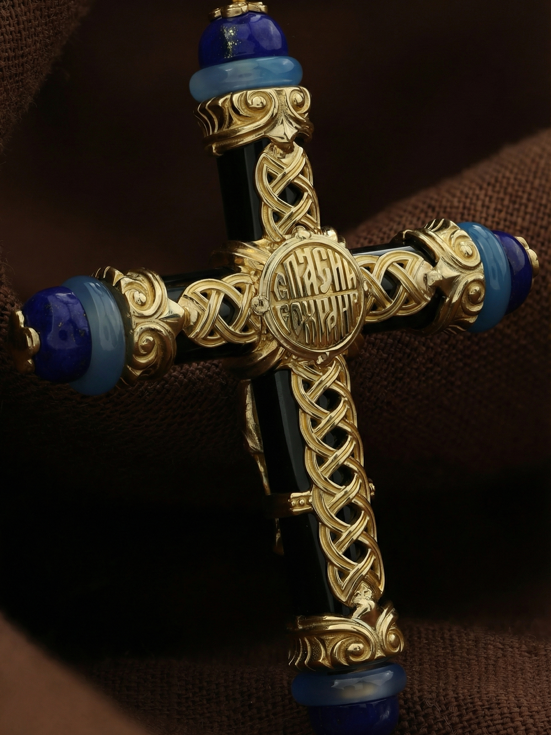 Крест из лимонного золота c ониксом, агатом и лазуритом