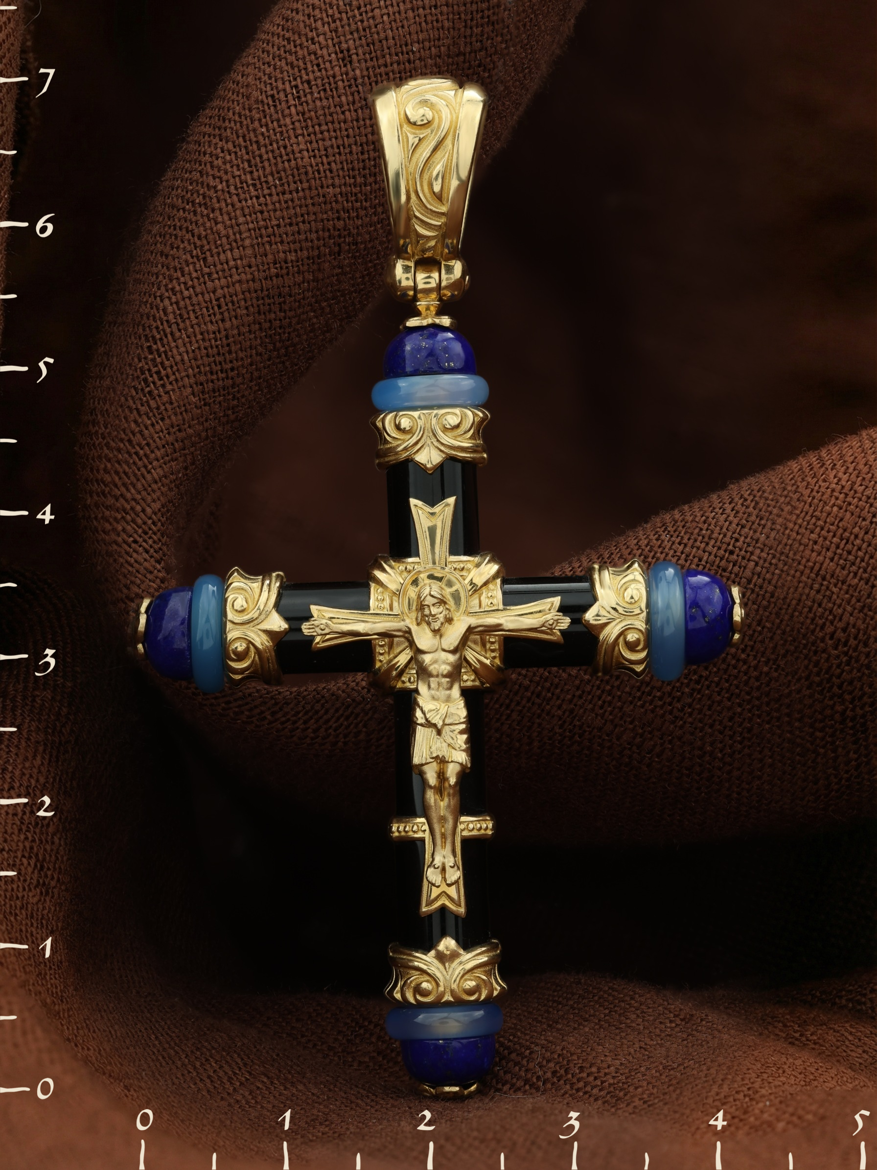 Крест из лимонного золота c ониксом, агатом и лазуритом