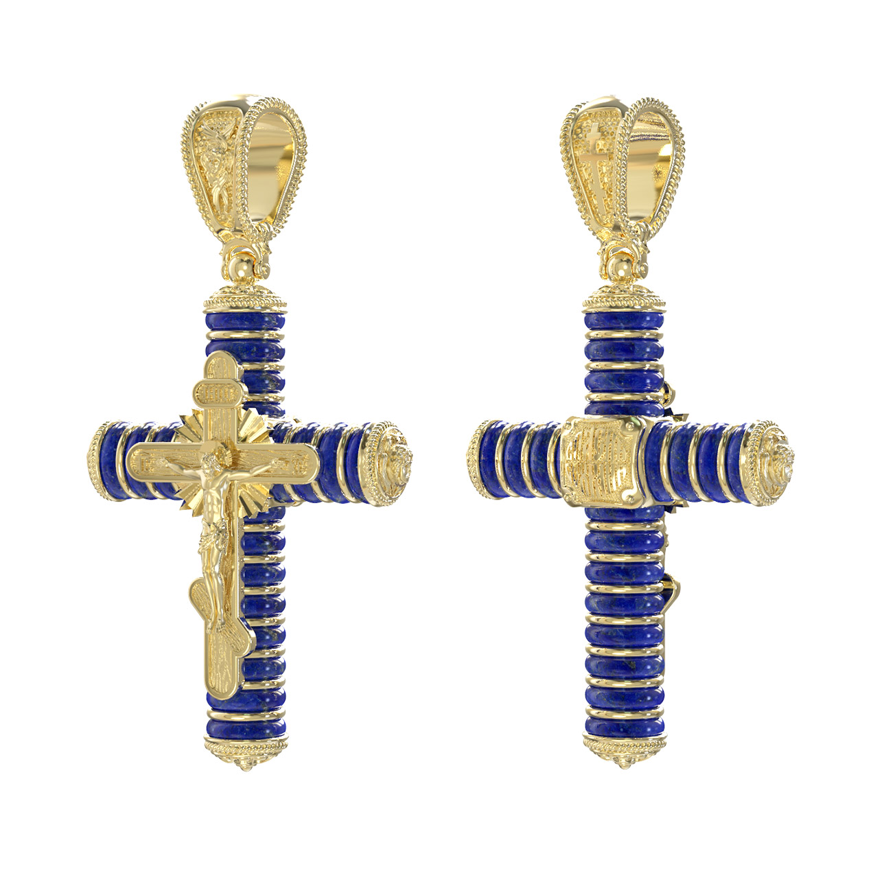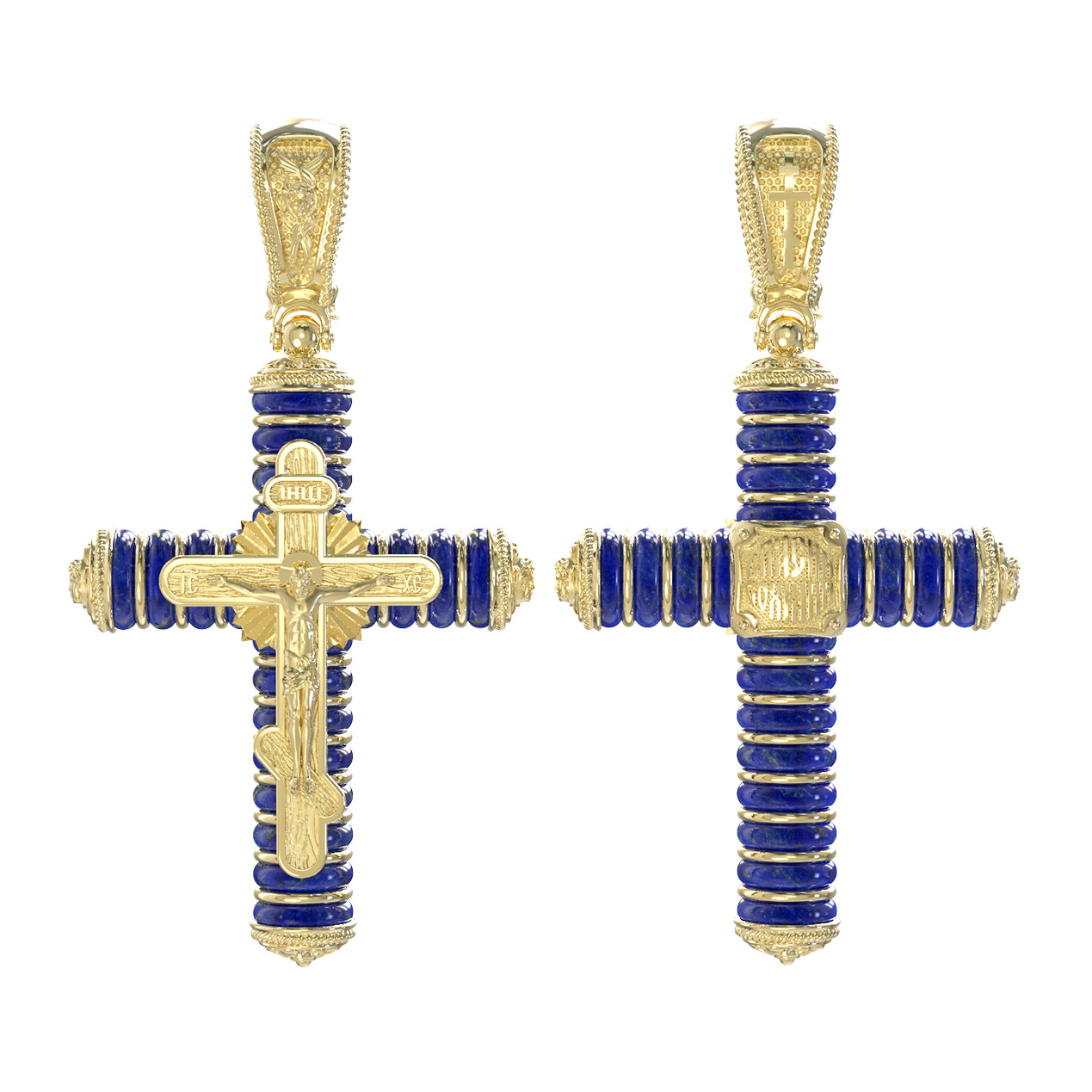 На лицевой стороне креста изображено Распятие Господа и Спасителя нашего Иисуса Христа. Своими крестными страданиями Господь смыл наши грехи, покрыл наш долг перед Богом или, на языке Писания, нас «искупил». В Голгофе сокрыта непостижимая тайна бесконечной правды и любви Бога. Крест стал символом победы добра над злом, жизни над смертью, напоминанием бесконечной Божьей любви, предметом радости. Воплотившийся Сын Божий Своею кровью освятил крест и сделал его проводником Своей благодати, источником освящения верующих. На верхней табличке, выше головы Иисуса, расположена надпись, составленная Понтием Пилатом — «IНЦI». Она означает «Иисус Назорей, Царь Иудейский». Надпись «IC» «ХC», означает Иисус Христос, помещаются на разных сторонах поперечной перекладины креста. Христос в Своей Божественной любви, над которой смерть не властна и которая, страдая, и не страдает в обычном смысле, простирает к людям со Креста Свои объятия, в которые призывается и привлекается весь мир. Поэтому Тело Его не висит, а торжественно покоится на Кресте. На кулонном кольце изображен шестикрылый Серафим. Серафим означает «Пламенный». Горя любовью к Богу, он зажигает огонь этой любви и в сердцах людей.