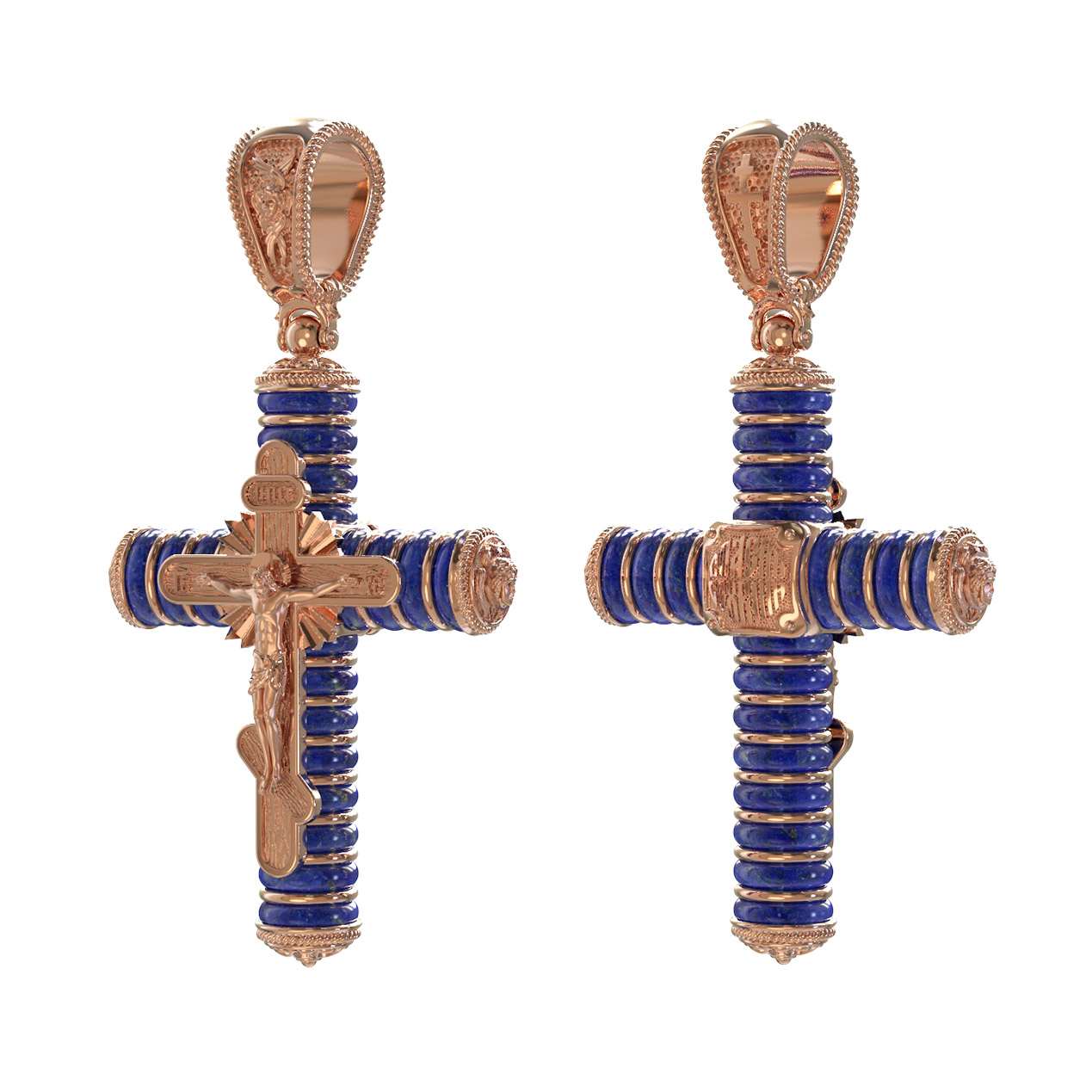 На лицевой стороне креста изображено Распятие Господа и Спасителя нашего Иисуса Христа. Своими крестными страданиями Господь смыл наши грехи, покрыл наш долг перед Богом или, на языке Писания, нас «искупил». В Голгофе сокрыта непостижимая тайна бесконечной правды и любви Бога. Крест стал символом победы добра над злом, жизни над смертью, напоминанием бесконечной Божьей любви, предметом радости. Воплотившийся Сын Божий Своею кровью освятил крест и сделал его проводником Своей благодати, источником освящения верующих. На верхней табличке, выше головы Иисуса, расположена надпись, составленная Понтием Пилатом — «IНЦI». Она означает «Иисус Назорей, Царь Иудейский». Надпись «IC» «ХC», означает Иисус Христос, помещаются на разных сторонах поперечной перекладины креста. Христос в Своей Божественной любви, над которой смерть не властна и которая, страдая, и не страдает в обычном смысле, простирает к людям со Креста Свои объятия, в которые призывается и привлекается весь мир. Поэтому Тело Его не висит, а торжественно покоится на Кресте. На кулонном кольце изображен шестикрылый Серафим. Серафим означает «Пламенный». Горя любовью к Богу, он зажигает огонь этой любви и в сердцах людей.
