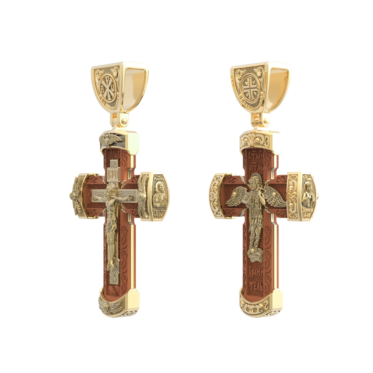 В центре оборота креста изображен Ангела Хранителя с традиционными атрибутами в руках: крестом, которым он осеняет человека, и мечом для прогнания бесов. По Православному учению, каждому, принявшему святое крещение, дается Господом Ангел Хранитель, который сопровождает человека всю его жизнь, помогая в добрых делах и охраняя от нападок злых духов. Святые отцы утверждают, что только верующий человек имеет рядом с собой Ангела Хранителя: «Тем, которые сподобились крещения и возносятся на высоту добродетелей, даны от Бога Ангелы, заботящиеся о них и содействующие им. В этом уверяет нас Господь, когда говорит, что есть Ангелы Хранители у всякого, кто верует в Него» (преп. Анастасий Синаит). Но Ангел Хранитель пребывает с христианином, если только мы не прогоним его греховными делами, поскольку «как дым разгоняет пчел, так и грех прогоняет от нас Ангела Хранителя» (свт. Василий Великий). Но и после завершения земного пути Ангел Хранитель не покидает христианина, а помогает душе преодолеть воздушные мытарства на пути в Царство Небесное.