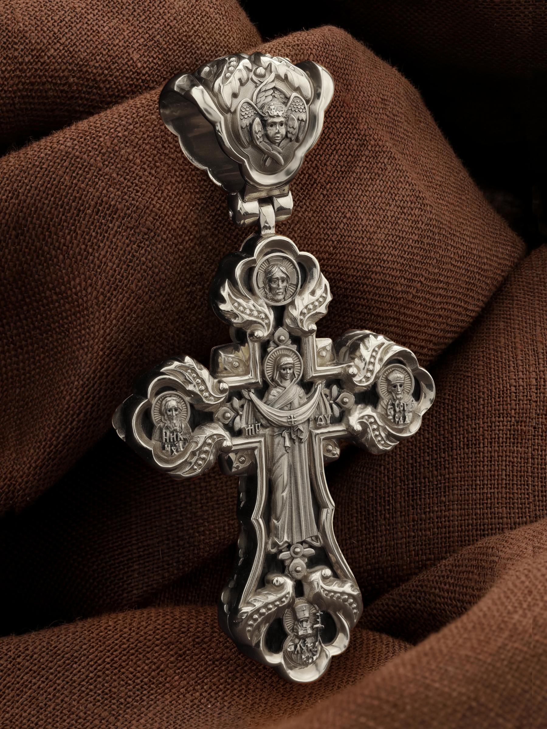 Центральную часть оборотной стороны креста украшает икона «Покров Пресвятой Богородицы». В руках Божьей Матери находится омофор, который она распростерла над людьми, покрывая их от всякого зла. Выше образа изображен Спас Нерукотворный, ниже — Святитель Лука (Войно-Ясенецкий). Слева от Распятия изображен Святитель Николай Чудотворец, архиепископ Мир Ликийских, справа — Преподобный Сергий, игумен Радонежский, Чудотворец. На кулонном кольце помещено изображение шестикрылого Серафима.