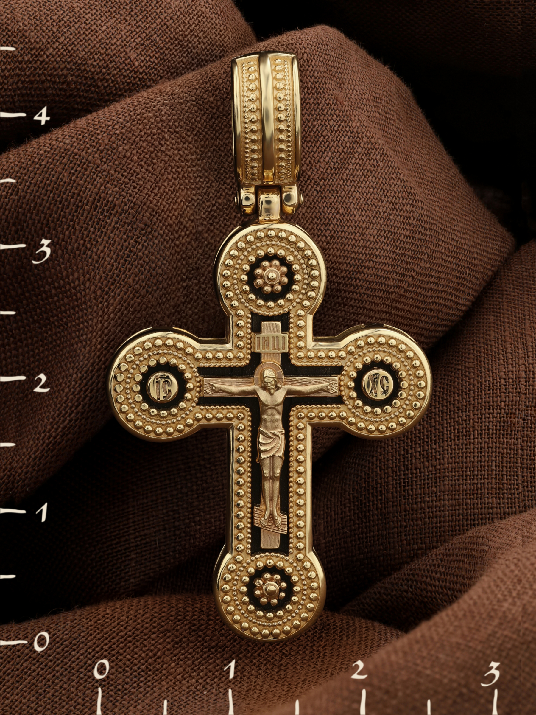 На лицевой стороне креста изображено Распятие Господа и Спасителя нашего Иисуса Христа. Своими крестными страданиями Господь смыл наши грехи, покрыл наш долг перед Богом или, на языке Писания, нас «искупил». В Голгофе сокрыта непостижимая тайна бесконечной правды и любви Бога. Крест стал символом победы добра над злом, жизни над смертью, напоминанием бесконечной Божьей любви, предметом радости. Воплотившийся Сын Божий Своею кровью освятил крест и сделал его проводником Своей благодати, источником освящения верующих. На верхней табличке, выше головы Иисуса, расположена надпись, составленная Понтием Пилатом — «IНЦI». Она означает «Иисус Назорей, Царь Иудейский». Надпись «IC» «ХC», означает Иисус Христос, помещаются на разных сторонах поперечной перекладины креста. Христос в Своей Божественной любви, над которой смерть не властна и которая, страдая, и не страдает в обычном смысле, простирает к людям со Креста Свои объятия, в которые призывается и привлекается весь мир. Поэтому Тело Его не висит, а торжественно покоится на Кресте