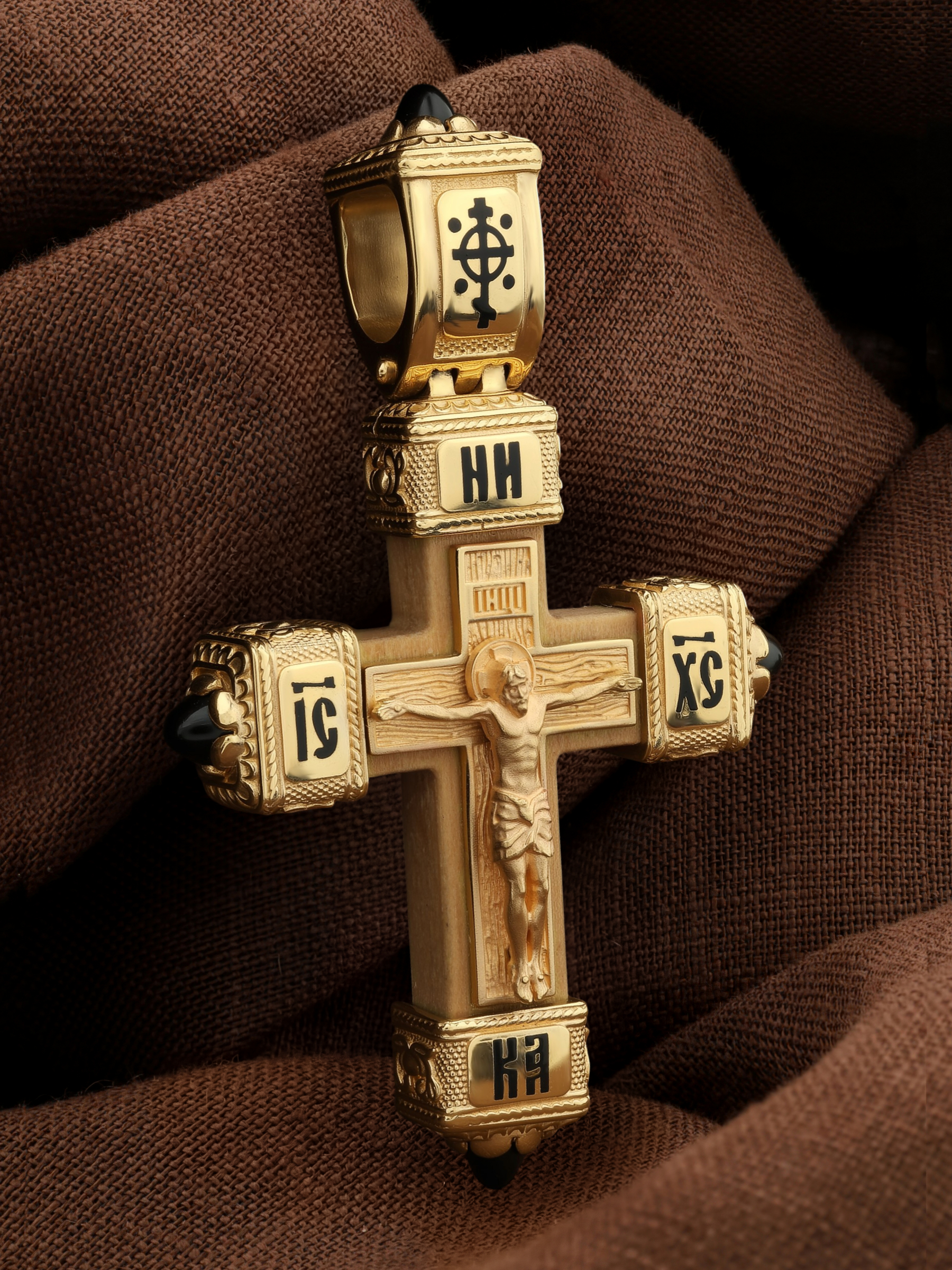 Крест из лимонного золота c эмаль, ониксом и деревом груши