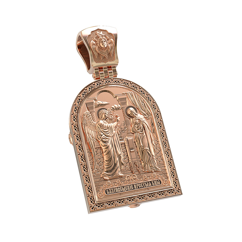 Основной композицией оборотной стороны является «Благовещение Пресвятой Богородицы». Благовещение — праздник великого откровения — получения Девой Марией Благой Вести о чудесном зачатии Божиего Сына.