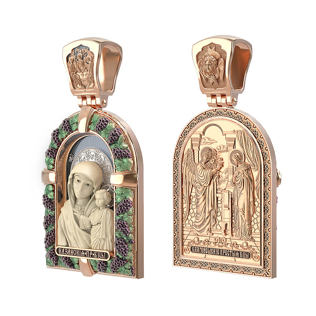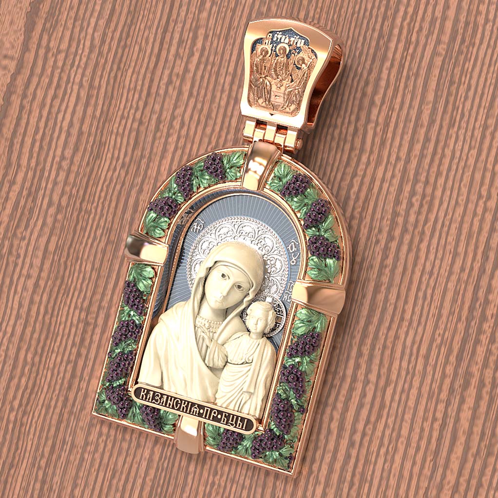 Казанская икона Божией Матери — одна из самых почитаемых в России чудотворных икон Богородицы. Богословское значение Казанской иконы — указать верующим истинный Путь к спасению, который лежит через Христа. Только Божия Матерь имеет настолько сильное дерзновение к Спасителю, что может ходатайствовать перед Ним за всех верных. Именно этот образ дарится новой повенчанной паре, как хранитель очага и семейная реликвия. Молитва перед Казанской иконой Божьей Матери помогает во всех сложных случаях жизни, в болезнях, во всех печалях, невзгодах, скорбях. Уникальная история появления, чудеса, случившиеся по молитвам православных людей возле образа — все это делает Казанскую Богородицу особенной, среди тысяч других икон. Вверху — икона Святой Троицы, на которой запечатлено явление Триединого Бога праотцу Аврааму в виде трех ангелов. Образок обвивает виноградная лоза — один из самых распространенных символических образов христианства. Она является символом Иисуса Христа, Который в Евангелии говорит о Себе: «Я есмь истинная виноградная лоза, и Отец мой — виноградарь». (Ин. 15:1). Поэтому именно из винограда изготавливается вино для Причастия, призванное символизировать Кровь Христову.