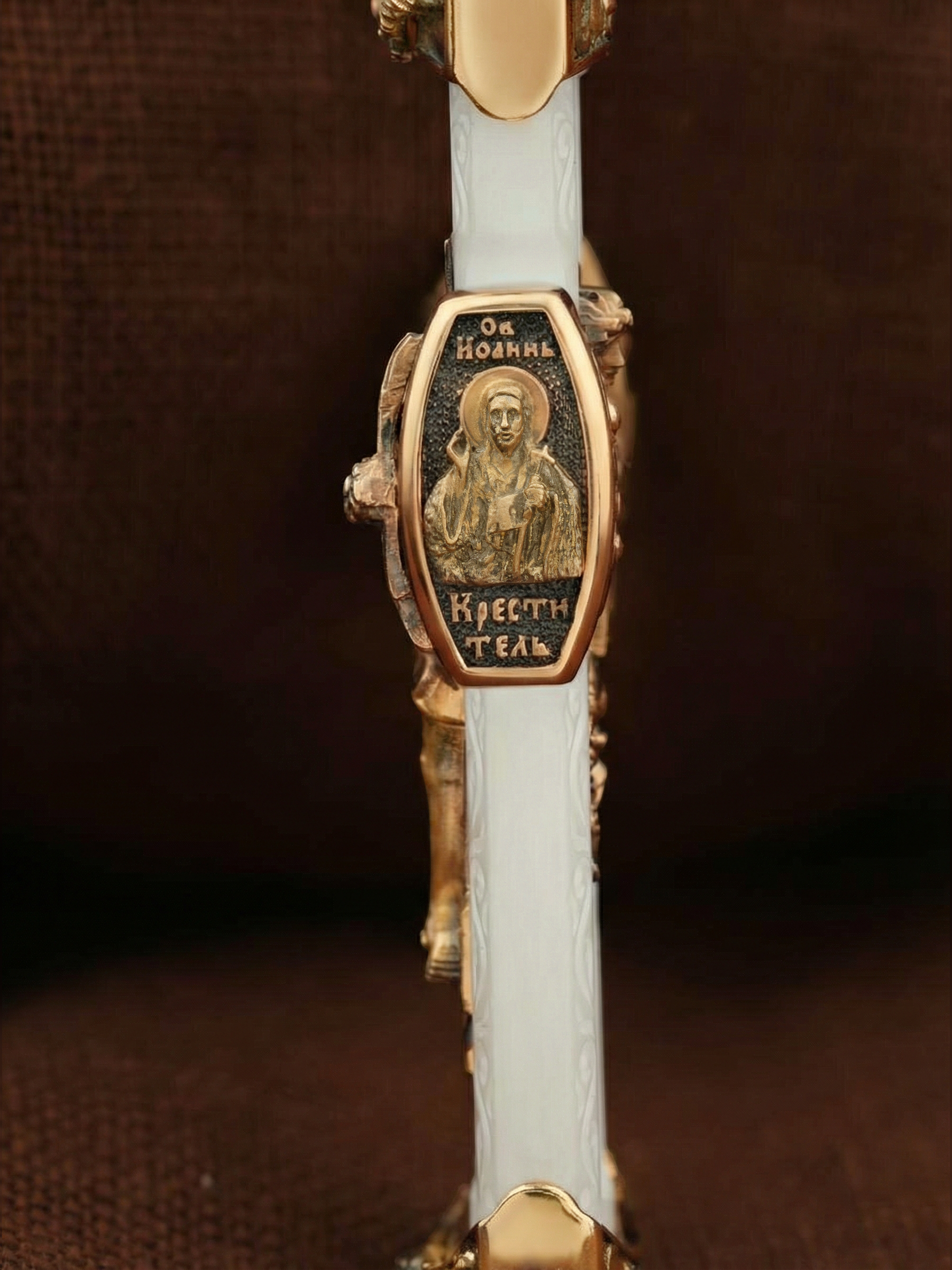 На торце изделия с левой стороны помещена икона Святого Николая Чудотворца — самый почитаемый в Православной Церкви, которого еще называют Николай Угодник за то, что он угодил своей жизнью Богу. Николай Чудотворец, помощник в делах, покровитель учащихся, утешитель обиженных и нуждающихся, целитель самых страшных и тяжелых недугов, предстатель и молитвенник за людей перед Богом. Также Святитель Николай Чудотворец известен своими молитвами за путешественников, когда непрестанный ветер и бушующие волны утихают и корабль заходит в спокойную гавань. На торце изделия с правой стороны — икона Святого Иоанна Крестителя. Святой Иоанн был последним пророком Израиля. Он призывал к покаянию, предвозвещая приближение Царствия Небесного (Мф. 3, 2), и удостоился стать Крестителем Христа. Иисус Христос говорит о нем: «Сей есть о котором написано: «Вот, Я посылаю Ангела Моего пред лицем Твоим, который приготовит путь Твой пред Тобою» (Лк. 7, 27). И еще: «Из рожденных женами нет ни одного пророка больше Иоанна Крестителя» (Лк. 7, 28).