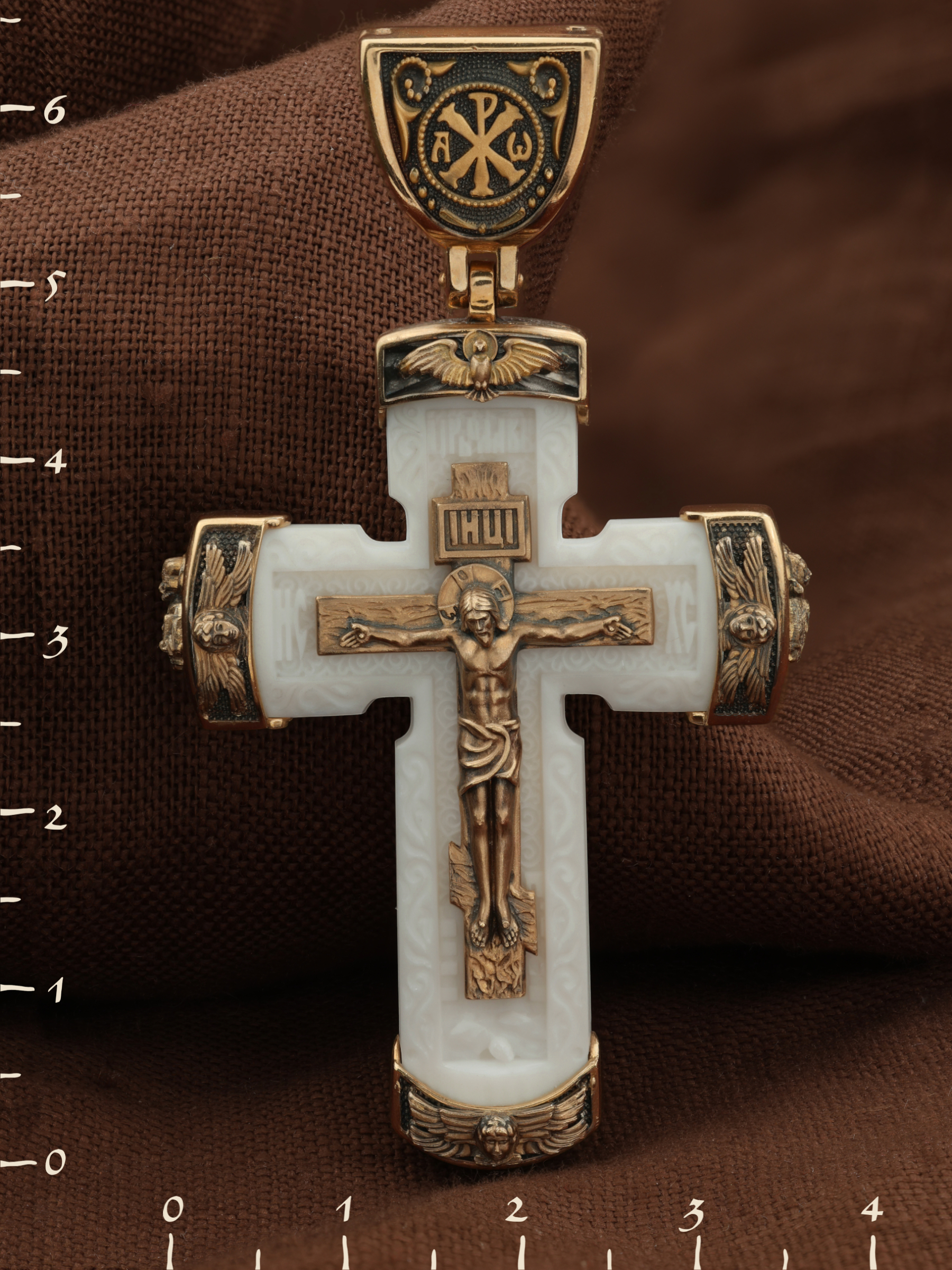 На лицевой стороне креста изображено Распятие, потому что это орудие казни Иисус Христос сделал орудием победы над грехом и смертью. Своими страданиями Он искупил грехи человечества, умерев и сошествовав во ад, победил сатану, освободил души праведников от вечной смерти и открыл им небесные врата рая. Жертва Христа сделала возможным спасение для каждого человека. На православном кресте Христос не умирает, а свободно простирает руки, ладони Иисуса открыты, будто он хочет обнять все человечество, даря им свою любовь и открывая путь к вечной жизни.