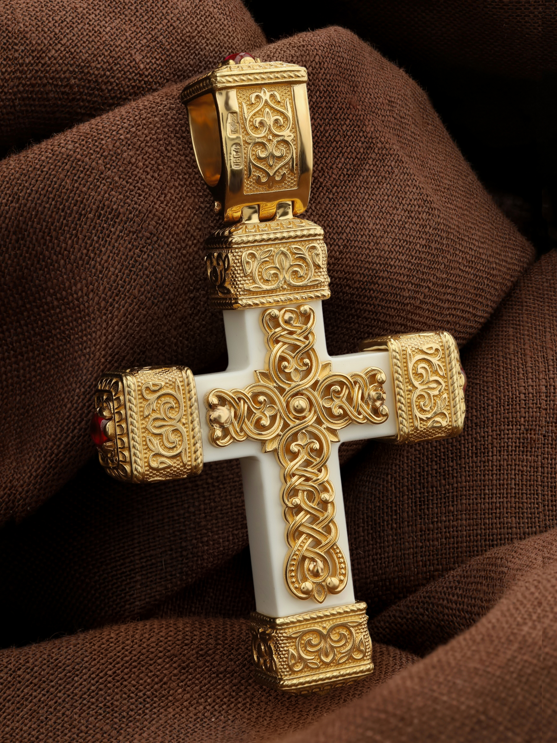 Крест из лимонного золота c эмаль, рубином и бивнем мамонта