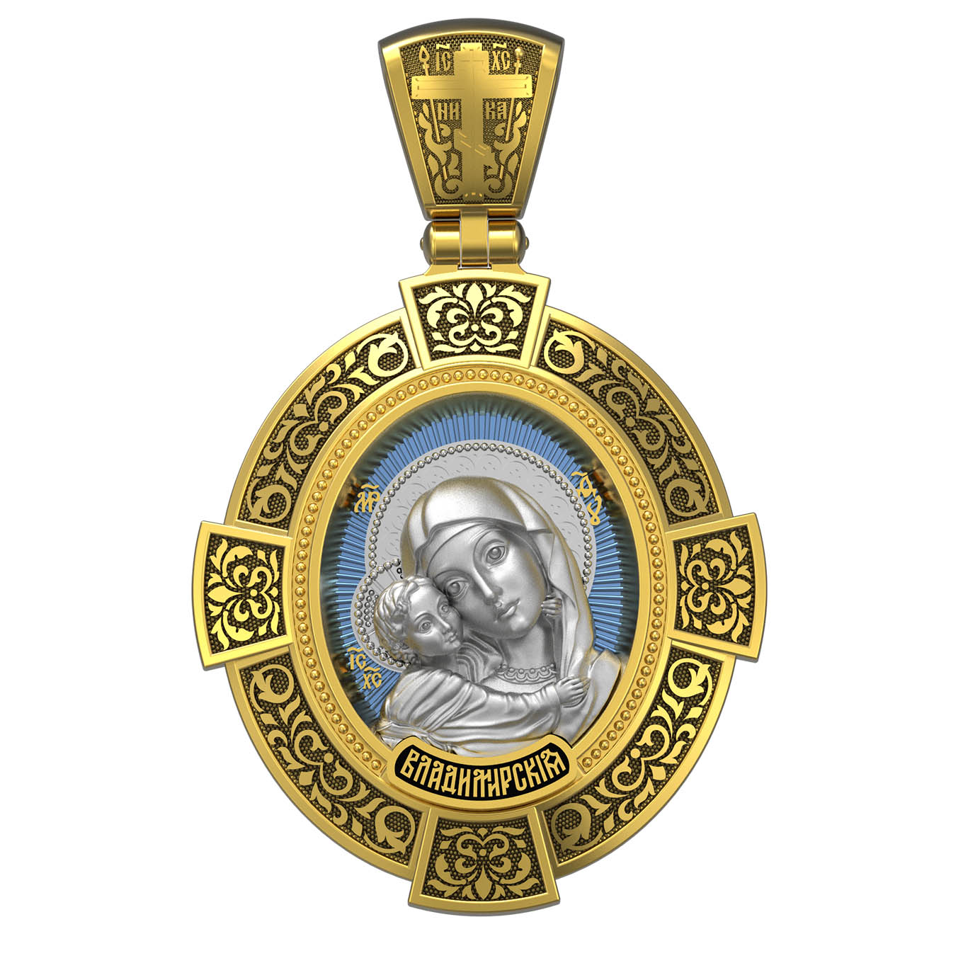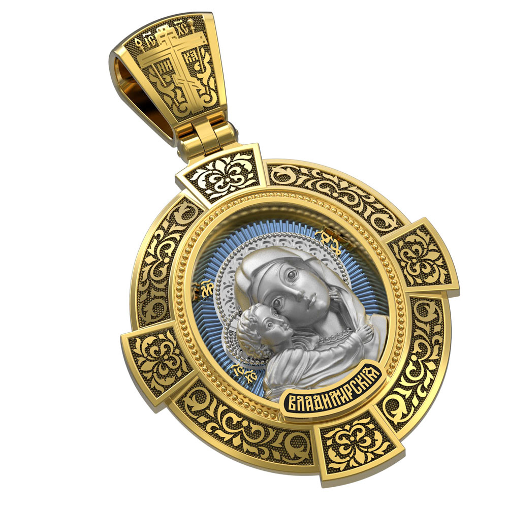 На лицевой стороне образка изображена Владимирская икона Божией Матери — одна из самых чтимых святынь Русской православной церкви. По преданию, икона была написана Святым апостолом и евангелистом Лукой во время земной жизни Богородицы. Дева Мария, увидев Свое изображение, молвила: «Отныне ублажат Мя вси роди. Благодать Рождшегося от Меня и Моя с сим образом да будет». Образ написан в лирическом иконографическом типе «Умиление». Младенец припал щекой к щеке Матери и тянется к ней правой рукой, другой нежно обнимая за шею. Икона вплоть до V века находилась в Иерусалиме, затем была перевезена в Византию. На Русь икона была привезена в 1131 г. За прошедшие столетия святыня неоднократно переезжала из Владимира в Москву и обратно, не раз спасая страну от захватчиков. Русская Православная Церковь установила троекратное празднование Владимирской иконе Божьей Матери. Каждый из дней празднования связан с избавлением русского народа от порабощения иноплеменниками по молитвам ко Пресвятой Богородице. В последующие века у иконы происходили многие важные исторические события: подписание актов, принятие присяги значимых государственных деятелей и возведение на престол. На кулонном кольце изображен Спас Нерукотворный — образ Господа и Спасителя нашего Иисуса Христа, чудесно отпечатавшийся на плате, котором Христос вытер свой лик.