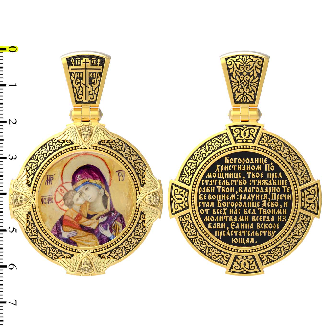 На лицевой стороне образка изображена Владимирская икона Божией Матери — одна из самых чтимых святынь Русской православной церкви. По преданию, икона была написана Святым апостолом и евангелистом Лукой во время земной жизни Богородицы. Дева Мария, увидев Свое изображение, молвила: «Отныне ублажат Мя вси роди. Благодать Рождшегося от Меня и Моя с сим образом да будет». Образ написан в лирическом иконографическом типе «Умиление». Младенец припал щекой к щеке Матери и тянется к ней правой рукой, другой нежно обнимая за шею. Икона вплоть до V века находилась в Иерусалиме, затем была перевезена в Византию. На Русь икона была привезена в 1131 г. За прошедшие столетия святыня неоднократно переезжала из Владимира в Москву и обратно, не раз спасая страну от захватчиков. Русская Православная Церковь установила троекратное празднование Владимирской иконе Божьей Матери. Каждый из дней празднования связан с избавлением русского народа от порабощения иноплеменниками по молитвам ко Пресвятой Богородице. В последующие века у иконы происходили многие важные исторические события: подписание актов, принятие присяги значимых государственных деятелей и возведение на престол. На кулонном кольце изображен Спас Нерукотворный — образ Господа и Спасителя нашего Иисуса Христа, чудесно отпечатавшийся на плате, котором Христос вытер свой лик.