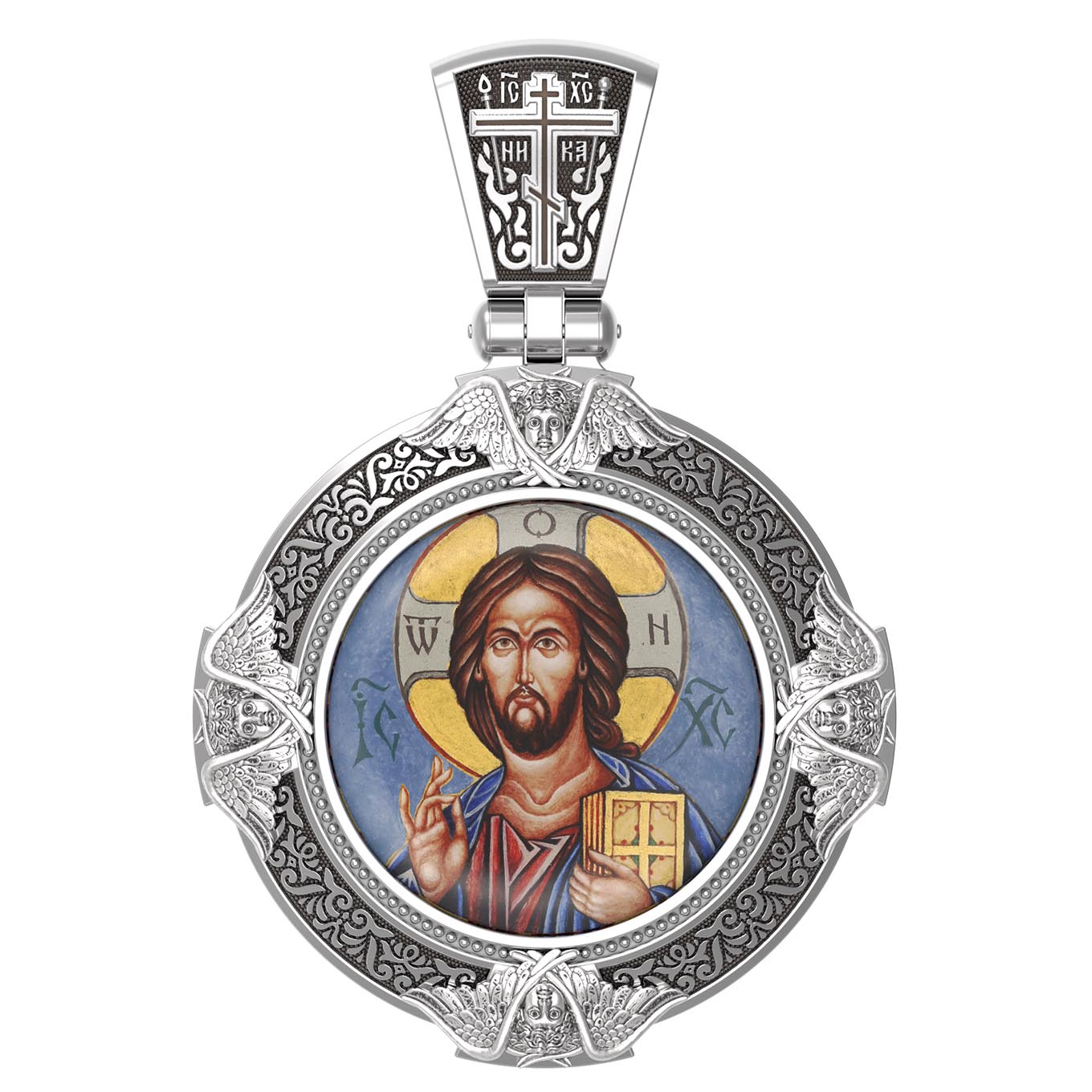 На лицевой стороне образка изображена икона Господа и Спасителя нашего Иисуса Христа  — Господь Вседержитель или Пантократор (от греч. всевластный, всесильный). Он представлен как Царь Небесный и будущий Судия мира. Именование Иисуса «Вседержителем» указывает, с одной стороны, на Его Божественную природу: «Аз есмь Альфа и Омега, начало и конец, говорит Господь, Который есть и был и грядет, Вседержитель» (Откр. 1: 8). С другой стороны, такое именование связано и с человеческой природой Христа, искупившего крестной жертвой людские грехи и обновившего тем самым человеческую природу. Господь Иисусь Христос изображен фронтально огрудно. Главу Спасителя осеняет нимб, на нем угадывается крест. Крест символизирует голгофскую жертву Спасителя. По греческой традиции, на нимбе написаны буквы Омега, Омикрон, Ню — вместе они обозначают слово Сущий, одно из имен и характеристику Бога, согласно Священному Писанию. Правой рукой Он благословляет, а левой держит Евангелие — благую весть, принесенную Христом всему миру. Также означает она тот новый мир, который будет сотворен Богом после второго пришествия Христа. Символизирует и Книгу Жизни, где записаны имена всех, возлюбивших Бога. Всемогущий Бог предстает здесь не как обличающий судья, а как милостивый отец, ждущий возвращения блудных детей.