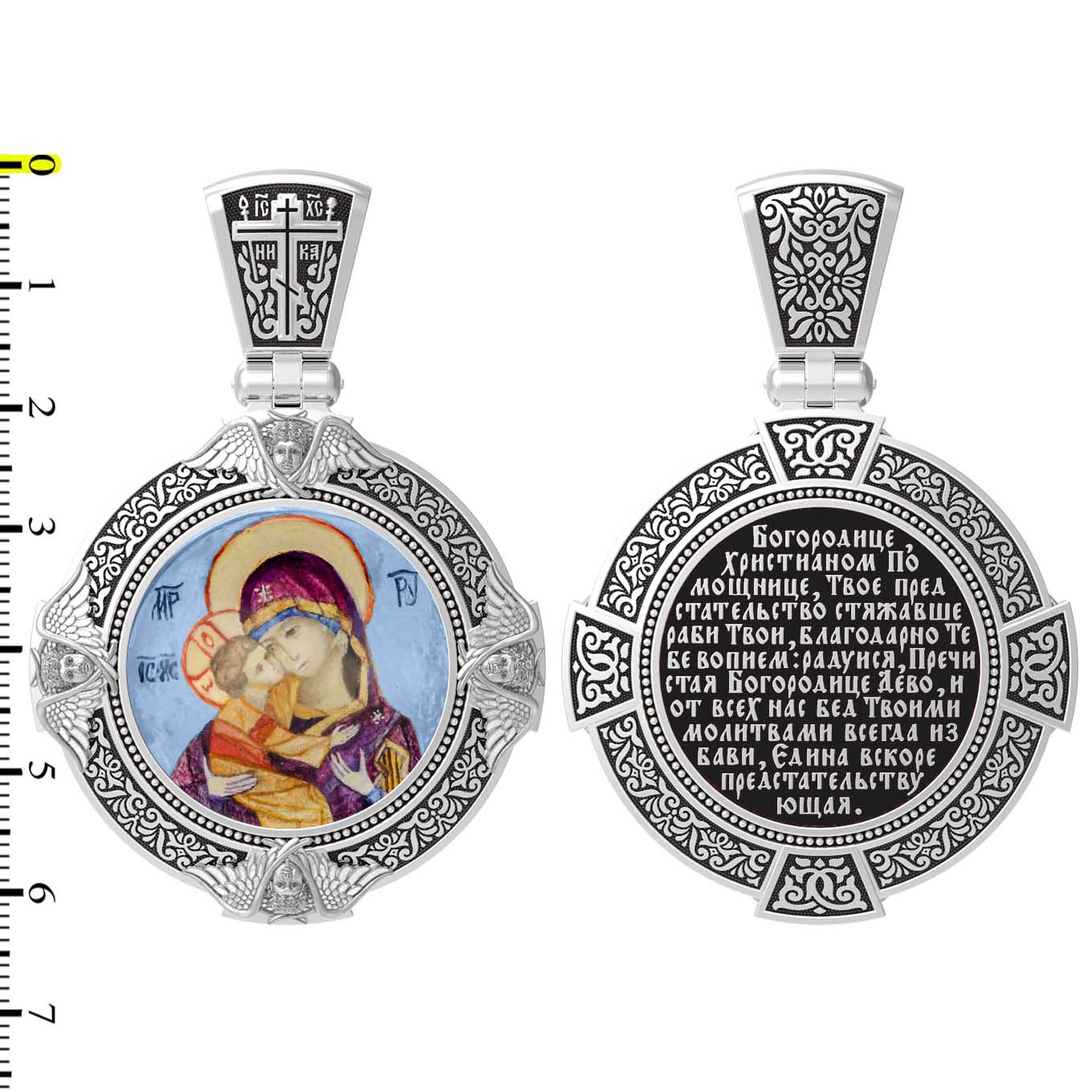 На лицевой стороне образка изображена Владимирская икона Божией Матери — одна из самых чтимых святынь Русской православной церкви. По преданию, икона была написана Святым апостолом и евангелистом Лукой во время земной жизни Богородицы. Дева Мария, увидев Свое изображение, молвила: «Отныне ублажат Мя вси роди. Благодать Рождшегося от Меня и Моя с сим образом да будет». Образ написан в лирическом иконографическом типе «Умиление». Младенец припал щекой к щеке Матери и тянется к ней правой рукой, другой нежно обнимая за шею. Икона вплоть до V века находилась в Иерусалиме, затем была перевезена в Византию. На Русь икона была привезена в 1131 г. За прошедшие столетия святыня неоднократно переезжала из Владимира в Москву и обратно, не раз спасая страну от захватчиков. Русская Православная Церковь установила троекратное празднование Владимирской иконе Божьей Матери. Каждый из дней празднования связан с избавлением русского народа от порабощения иноплеменниками по молитвам ко Пресвятой Богородице. В последующие века у иконы происходили многие важные исторические события: подписание актов, принятие присяги значимых государственных деятелей и возведение на престол. На кулонном кольце изображен Спас Нерукотворный — образ Господа и Спасителя нашего Иисуса Христа, чудесно отпечатавшийся на плате, котором Христос вытер свой лик.