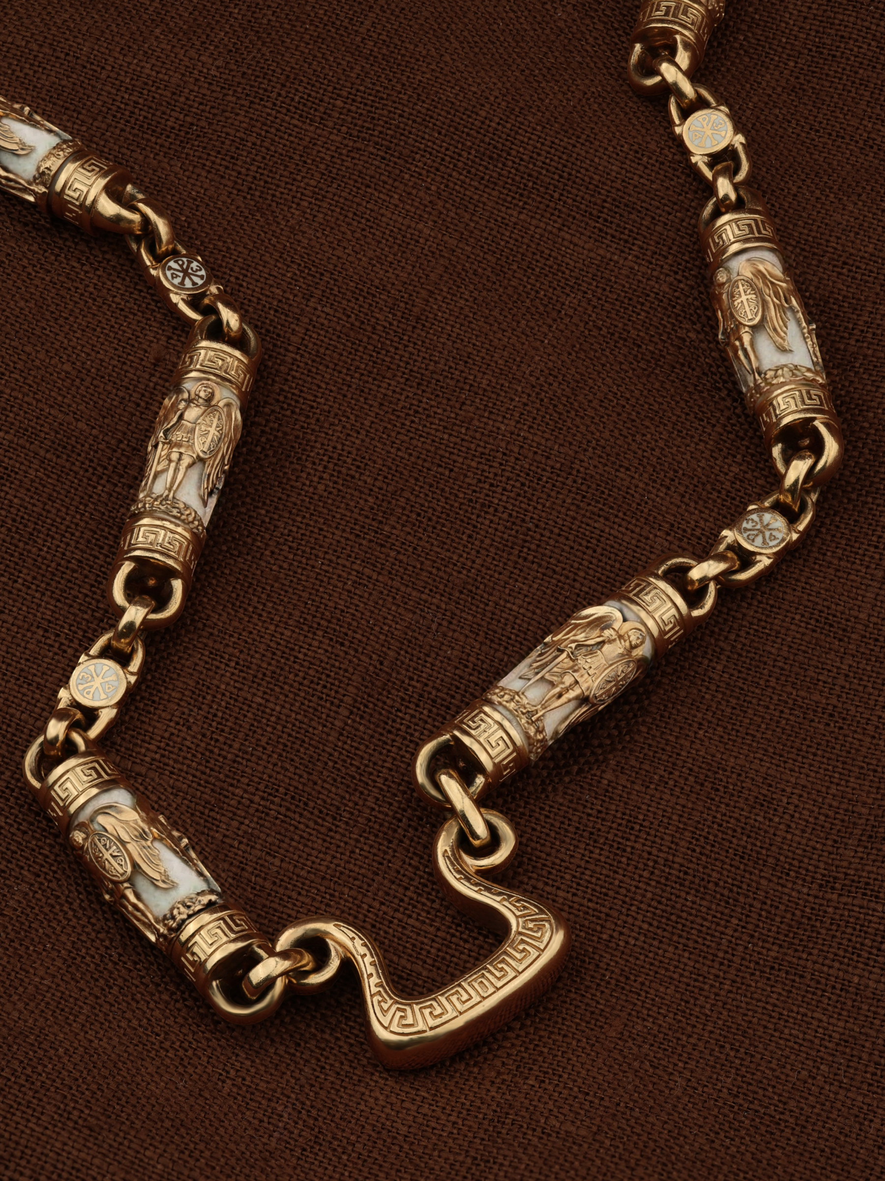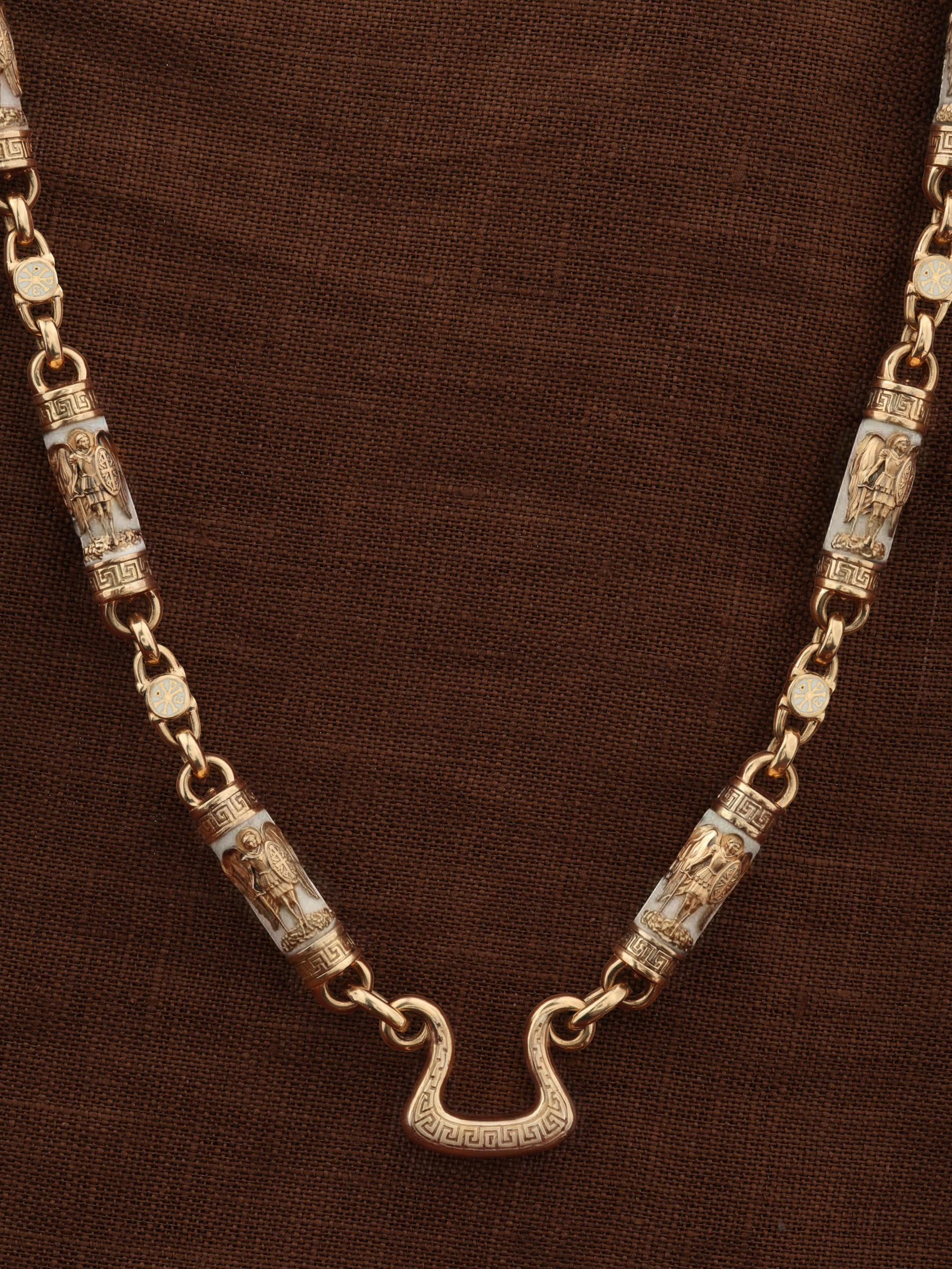 На звеньях цепи изображена Хризма — монограмма имени Христа, которая состоит из двух начальных греческих букв имени — Х (хи) и Р (ро), скрещённых между собой. По краям монограммы помещены греческие буквы a и w. Такое употребление этих букв восходит к тексту Апокалипсиса: «Аз есмь Альфа и Омега, начало и конец, говорит Господь, Который есть и был и грядет, Вседержитель.» (Откр. 1:8; см. также Откр. 22:13). Также на звеньях изображен Святой Ангел-Хранитель в виде прекрасного юноши держащего в правой руке мечь, а в левой — щит. Ангел-Хранитель — это Ангел приставляемый Богом к человеку при крещении для охраны и помощи в добрых делах. Он невидимо находится при человеке на протяжении всей его жизни, если человек сохраняет в себе любовь к Богу и истинную веру перед Ним. Ангел-Xранитель делают для нас все, что служит к истинному нашему благу и спасению. Невидимо пребывая при нас постоянно, он, руководствуя нас ко спасению, не только по нашему желанию таинственно наставляет нас на все доброе и полезное, не только возносит наши молитвы к Богу, но еще и сам от себя охраняют и защищают нас от врагов видимых и невидимых и ходатайствует за нас пред Богом. Ангел-Хранитель так любит нас, как никто на земле любить не может. Одного лишь каждому из нас он желает — спасения души; к этому он направляет все свои заботы. И если видит нас также заботящимися о спасении, радуется, если же видит нас пребывающими в нерадении о душе своей, скорбит. Но и самый великий грешник может примириться со своим Ангелом-Хранителем посредством искреннего раскаяния в грехах и оставления их навсегда. В таком случае, по слову Писания, великая радость бывает для всех ангелов на небесах (Лк. 15:10). Цепь украшена орнаментом.