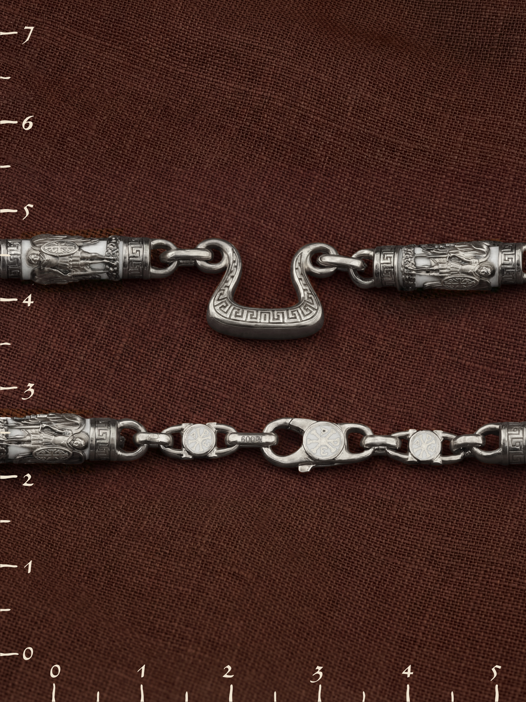 На звеньях цепи изображена Хризма — монограмма имени Христа, которая состоит из двух начальных греческих букв имени — Х (хи) и Р (ро), скрещённых между собой. По краям монограммы помещены греческие буквы a и w. Такое употребление этих букв восходит к тексту Апокалипсиса: «Аз есмь Альфа и Омега, начало и конец, говорит Господь, Который есть и был и грядет, Вседержитель.» (Откр. 1:8; см. также Откр. 22:13). Также на звеньях изображен Святой Ангел-Хранитель в виде прекрасного юноши держащего в правой руке мечь, а в левой — щит. Ангел-Хранитель — это Ангел приставляемый Богом к человеку при крещении для охраны и помощи в добрых делах. Он невидимо находится при человеке на протяжении всей его жизни, если человек сохраняет в себе любовь к Богу и истинную веру перед Ним. Ангел-Xранитель делают для нас все, что служит к истинному нашему благу и спасению. Невидимо пребывая при нас постоянно, он, руководствуя нас ко спасению, не только по нашему желанию таинственно наставляет нас на все доброе и полезное, не только возносит наши молитвы к Богу, но еще и сам от себя охраняют и защищают нас от врагов видимых и невидимых и ходатайствует за нас пред Богом. Ангел-Хранитель так любит нас, как никто на земле любить не может. Одного лишь каждому из нас он желает — спасения души; к этому он направляет все свои заботы. И если видит нас также заботящимися о спасении, радуется, если же видит нас пребывающими в нерадении о душе своей, скорбит. Но и самый великий грешник может примириться со своим Ангелом-Хранителем посредством искреннего раскаяния в грехах и оставления их навсегда. В таком случае, по слову Писания, великая радость бывает для всех ангелов на небесах (Лк. 15:10). Цепь украшена орнаментом.