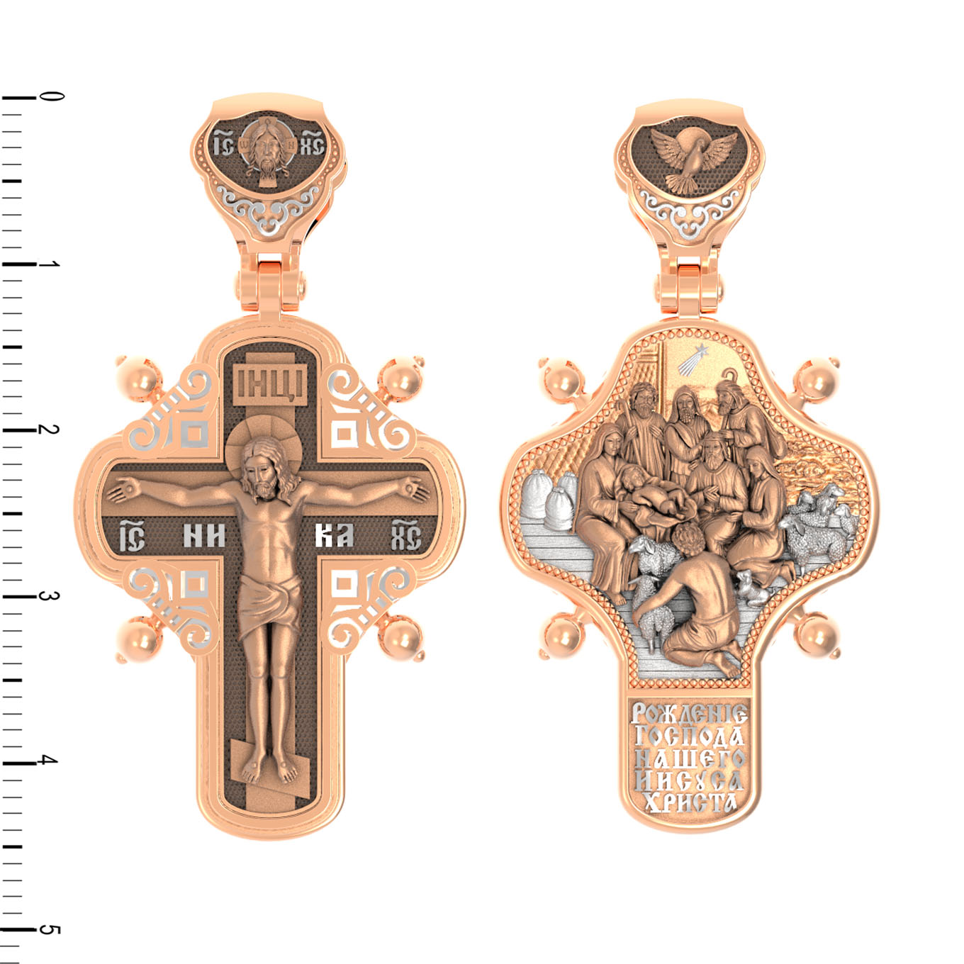 На оборотной стороне креста помещено изображение иконы «Рождество Христово». Господь Иисус Христос родился от Пресвятой Девы Марии в царствование императора Августа в городе Вифлееме. Как раз в это время Август повелел сделать всенародную перепись по всей своей империи, согласно которой каждый житель Палестины должен был идти в тот город, к которому испокон веков принадлежал его род. Пресвятая Богородица и праведный Иосиф, как происходившие от рода Давидова, должны были идти в Вифлеем (город Давида), чтобы внести свои имена в список подданных кесаря: «Пошел также и Иосиф из Галилеи, из города Назарета, в Иудею, в город Давидов, называемый Вифлеем, потому что он был из дома и рода Давидова, записаться с Мариею, обрученною ему женою, которая была беременна. Когда же они были там, наступило время родить Ей; и родила Сына своего Первенца, и спеленала Его, и положила Его в ясли, потому что не было им места в гостинице» (Лк.2:4−7).После рождения Спасителя на поле близ Вифлеема простым пастухам явились ангелы, благовествовавшие о пришествии в мир Христа песней славословия Господу: «Слава в вышних Богу, и на земли мир, в человецех благоволение!». Они повелели пастырям идти поклониться Младенцу. В это же время к Рожденному с дарами из дальних стран — златом, ливаном и смирной — пришли волхвы, которых к яслям Богомладенца привела воссиявшая в небе новая звезда. На кулонном кольце изображен Дух Святой в виде голубя сходящего с небес.