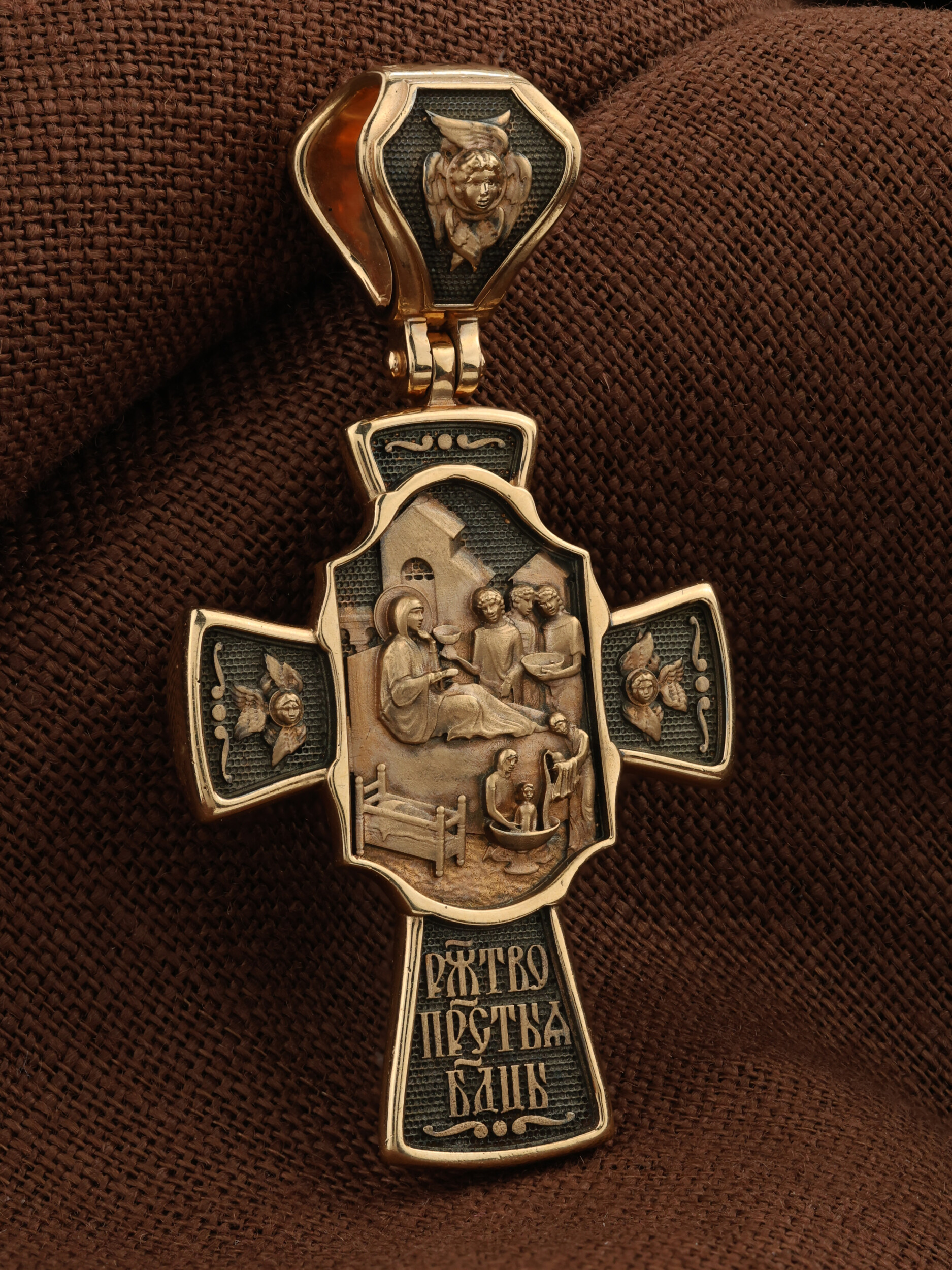 На оборотной стороне креста изображена икона Рождество Пресвятой Богородицы. Согласно церковному Преданию, Пресвятая Дева Мария родилась в небольшом галилейском городе Назарете. Родителями Её были праведные Иоаким и Анна. Супруги были бездетны, но не теряли надежды, что Господь может разрешить неплодство Анны даже в её преклонном возрасте. Они горячо молились и просили Господа даровать им дитя, которое обещали посвятить Богу для служения в храме. И Господь услышал их молитвы: Праведная Анна зачала и разрешилась дочерью Марией — будущей Пресвятой Богородицей. На кулонном кольце изображен шестикрылый Ангел — Серафим.