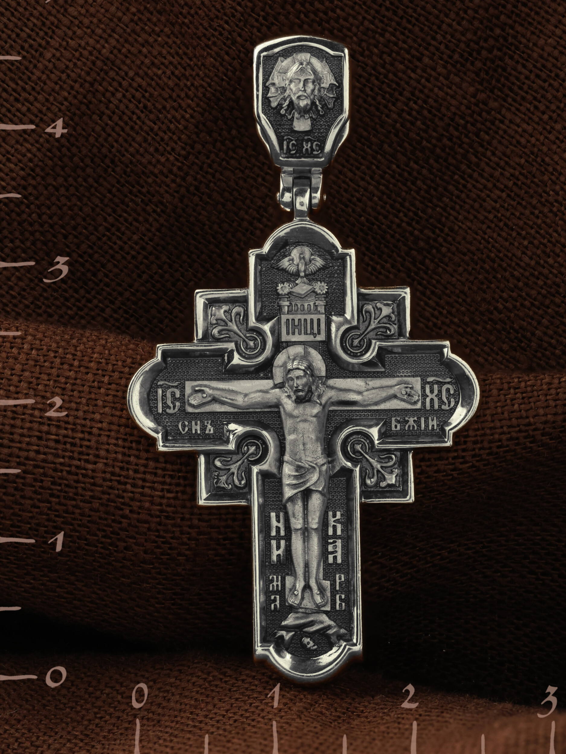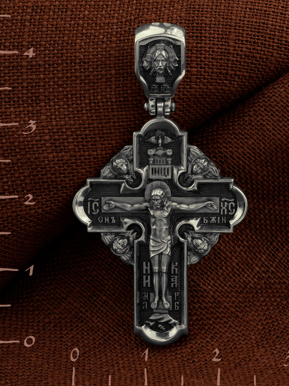 На лицевой стороне креста изображено Распятие Господа и Спасителя нашего Иисуса Христа. Крест- символ спасения и искупления рода человеческого, знамение победы над смертью и адом. Иисус Христос, как искупительная жертва освобождения человечества от власти греха, умер крестной смертью и в третий день воскрес. Верхняя перекладина символизирует титло — табличку, на которой, согласно Евангелию, было начертано: Иисус Назорей Царь Иудейский (IНЦI). Надпись «IC» «ХC», означает Иисус Христос, помещается на разных сторонах поперечной перекладины креста. Ниже перекладины расположено словосочетание «СЫН БОЖИЙ», что означает божественную природу Иисуса Христа. Надпись «МЛРБ» — «место лобное рай бысть» означает, что место лобное стало раем и помещаются в нижней части креста. Рядом — слово «НИКА», что означает «победитель». Возвышение, на котором стоит Крест, символизирует гору Голгофу, на которой произошло Распятие. Под подножием Креста изображена покоящаяся голова (череп) Адама. На кулонном кольце изображен Нерукотворный образ Господа и Спасителя нашего Иисуса Христа, чудесно отпечатавшийся на плате, которым Христос вытер свой лик. Ниже надпись — «IC» «ХC».