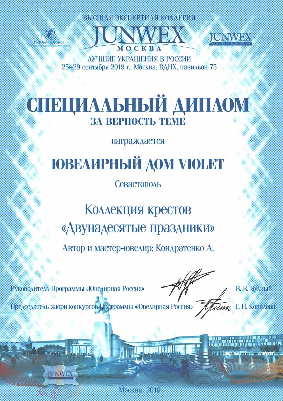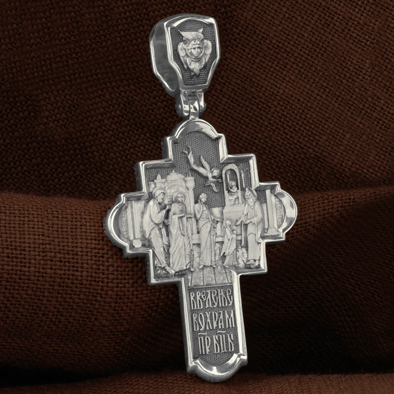На оборотной стороне креста изображена икона Введение во Храм Пресвятой Богородицы. По сохраненным Преданием рассказам, родители Девы Марии, праведные Иоаким и Анна, молясь о разрешении неплодства, дали обет, если родится дитя, посвятить его на служение Богу. Когда Пресвятой Деве исполнилось три года, святые родители решили выполнить свое обещание. Собрав родственников и знакомых, одев Пречистую Марию в лучшие одежды, с пением священных песней, с зажженными свечами в руках привели ее в Иерусалимский храм. Там встретил отроковицу первосвященник со множеством священников. В храм вела лестница в пятнадцать высоких ступеней. Младенец Мария, казалось, не могла бы Сама взойти по этой лестнице. Но как только Ее поставили на первую ступень, укрепляемая силой Божией, Она быстро преодолела остальные ступени и взошла на верхнюю. Затем первосвященник, по внушению свыше, ввел Пресвятую Деву в Святое святых, куда из всех людей только раз в году входил первосвященник с очистительной жертвенной кровью. Все присутствовавшие в храме дивились необыкновенному событию. На кулонном кольце изображен шестикрылый Ангел — Серафим.