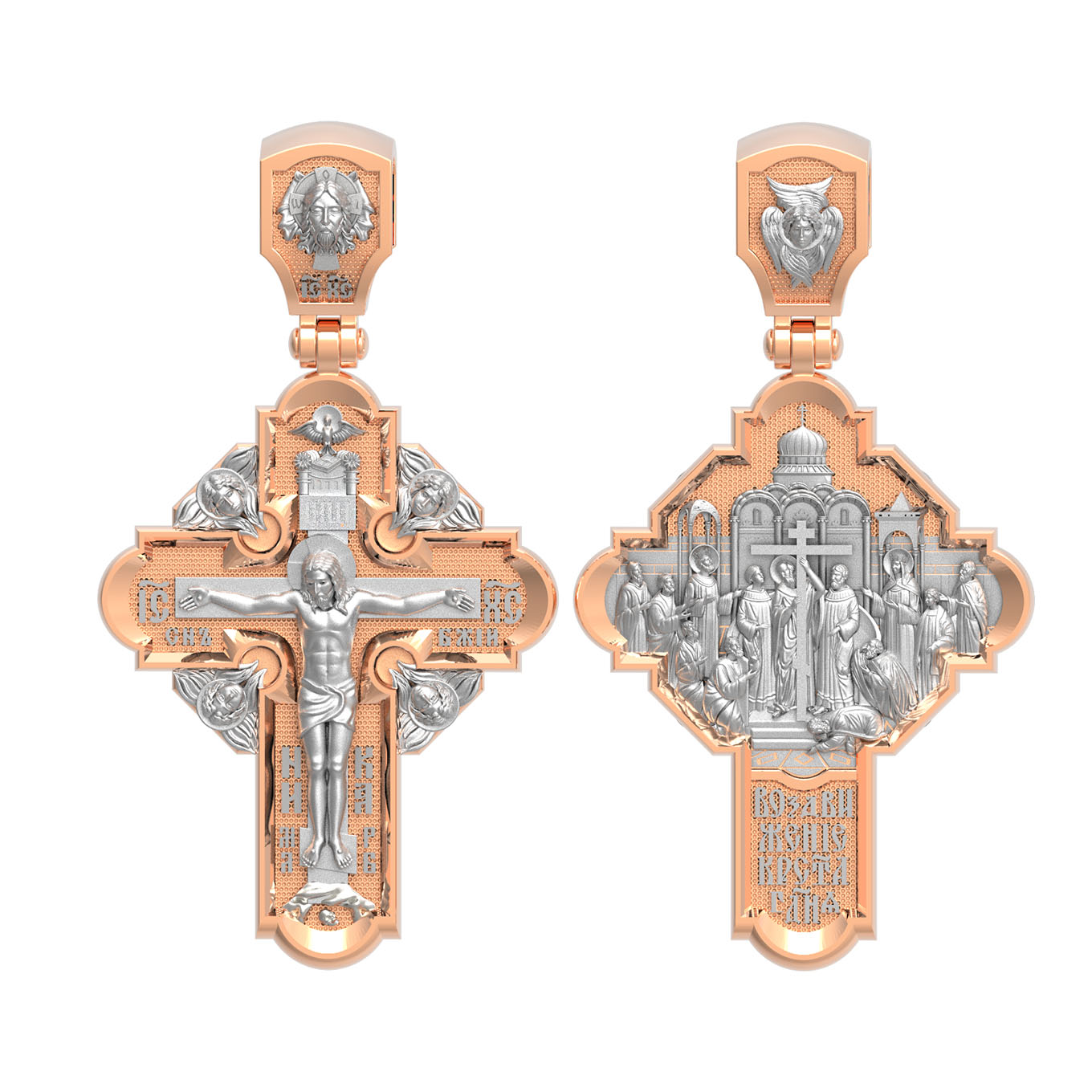 На оборотной стороне креста изображена икона Воздвижение Честного и Животворящего Креста Господня. Равноапостольный царь Константин пожелал построить храмы Божии на священных для христиан местах в Палестине и найти Крест, на котором был распят Спаситель. Исполнить желание царя взялась, с великою радостью, его мать, св. равноапостольная царица Елена. Крест был обретен в 326 году около горы Голгофы в Иерусалиме. C VII века с этим днём стали соединять память о возвращении Животворящего Креста из Персии византийским императором Ираклием (629). Праздник называется Воздвижением Креста, потому что и при обретении, и при возвращении Креста патриарх Макарий поднимал (Воздвигал) крест три раза, чтобы все могли его видеть. Народ же, видя Крест Спасителя, кланялся и восклицал: «Господи, помилуй!». Св. равноапостольные цари Константин и Елена, над местом страданий, погребения и воскресения Иисуса Христа построили обширный и великолепный храм в честь Воскресения Христова. На кулонном кольце изображен шестикрылый Ангел — Серафим.