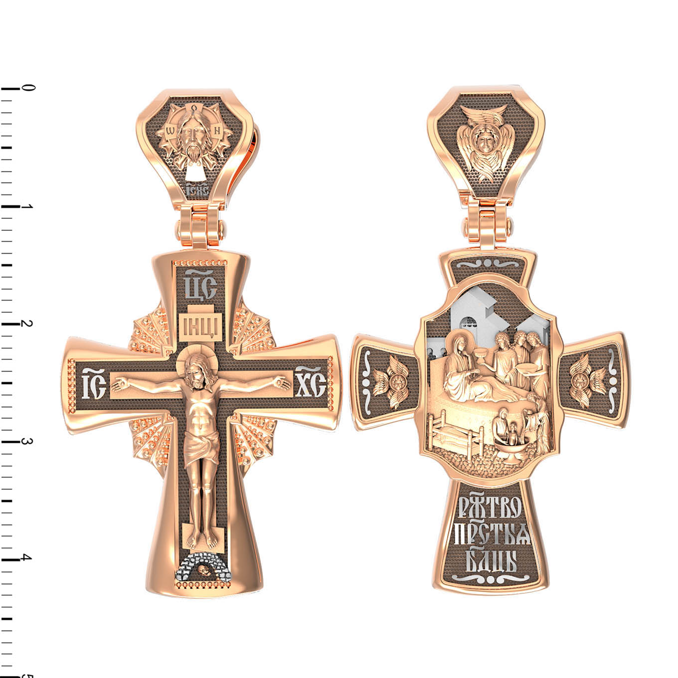 На оборотной стороне креста изображена икона Рождество Пресвятой Богородицы. Согласно церковному Преданию, Пресвятая Дева Мария родилась в небольшом галилейском городе Назарете. Родителями Её были праведные Иоаким и Анна. Супруги были бездетны, но не теряли надежды, что Господь может разрешить неплодство Анны даже в её преклонном возрасте. Они горячо молились и просили Господа даровать им дитя, которое обещали посвятить Богу для служения в храме. И Господь услышал их молитвы: Праведная Анна зачала и разрешилась дочерью Марией — будущей Пресвятой Богородицей. На кулонном кольце изображен шестикрылый Ангел — Серафим.
