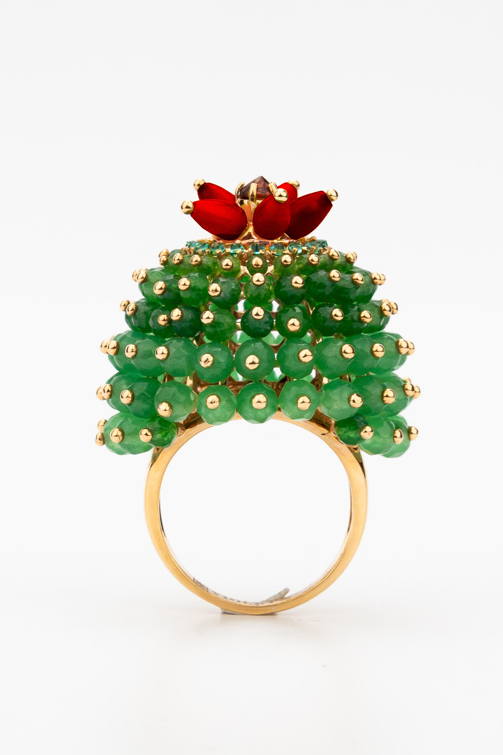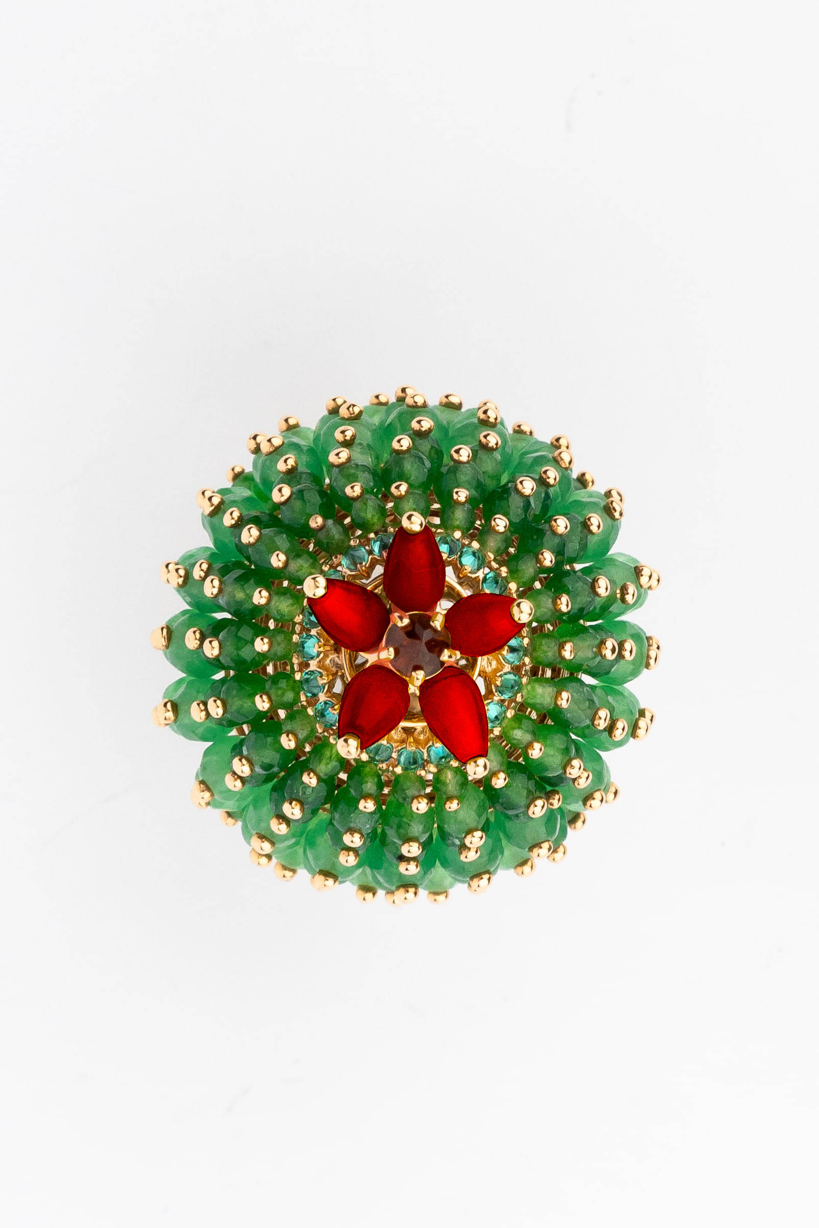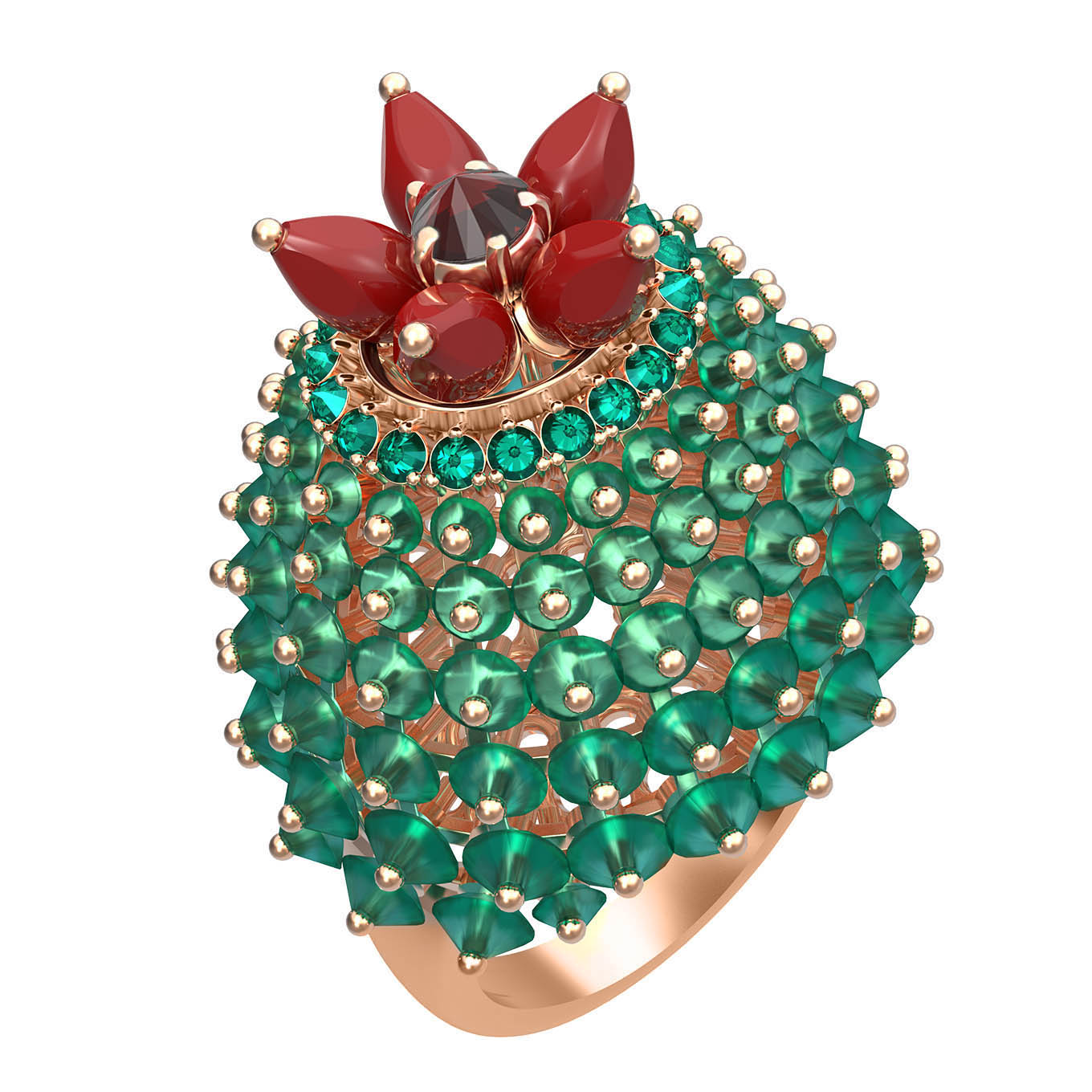 Кольцо из золота c гранатом, хризопразом, изумрудом и кораллом