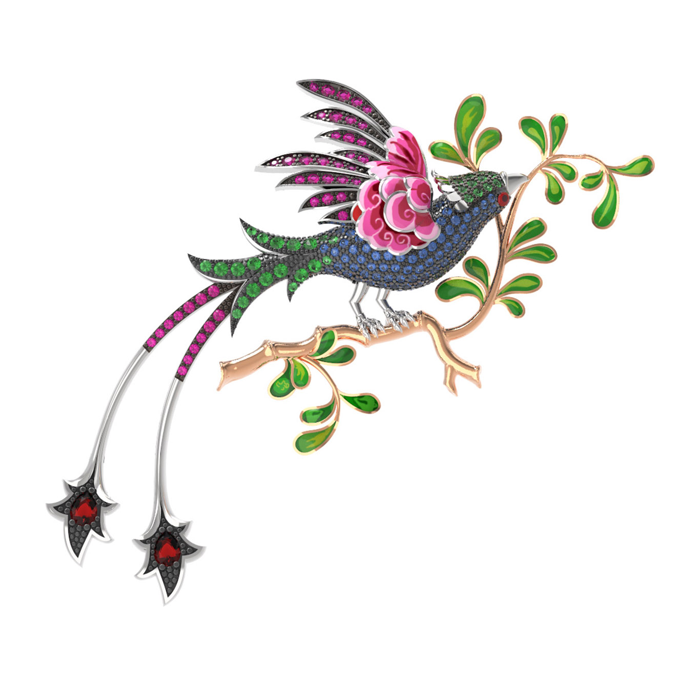 Брошь из белого золота c эмаль, фианитом и гранатом