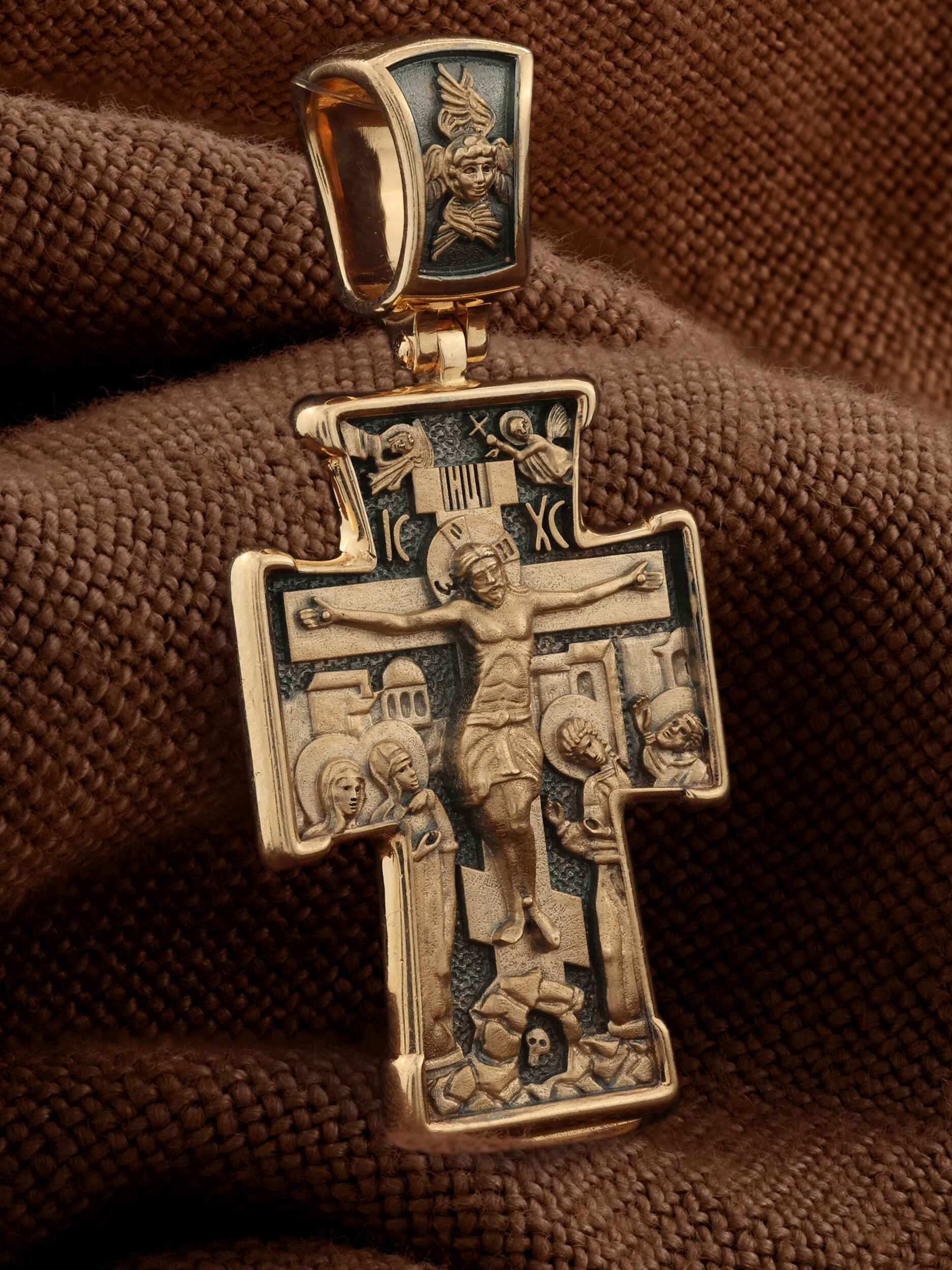 На лицевой стороне креста изображено Распятие Господа Иисуса Христа с предстоящими Ему святыми, которые, по преданию, находились у Креста Господа во время Его казни. Слева — Пресвятая Богородица и равноапостольная Мария Магдалина, справа — апостол Иоанн Богослов и мученик Лонгин Сотник. Верхняя перекладина креста символизирует титло — табличку, на которой, согласно Евангелию, было начертано: «Иисус Назорей Царь Иудейский» (IНЦI). Над перекладиной пишется сокращенно имя Спасителя «IC XC» — Иисус Христос. Возвышение, на котором стоит Крест, символизирует гору Голгофу, на которой произошло Распятие. У подножия Креста изображают прах Адама, обозначенный черепом.