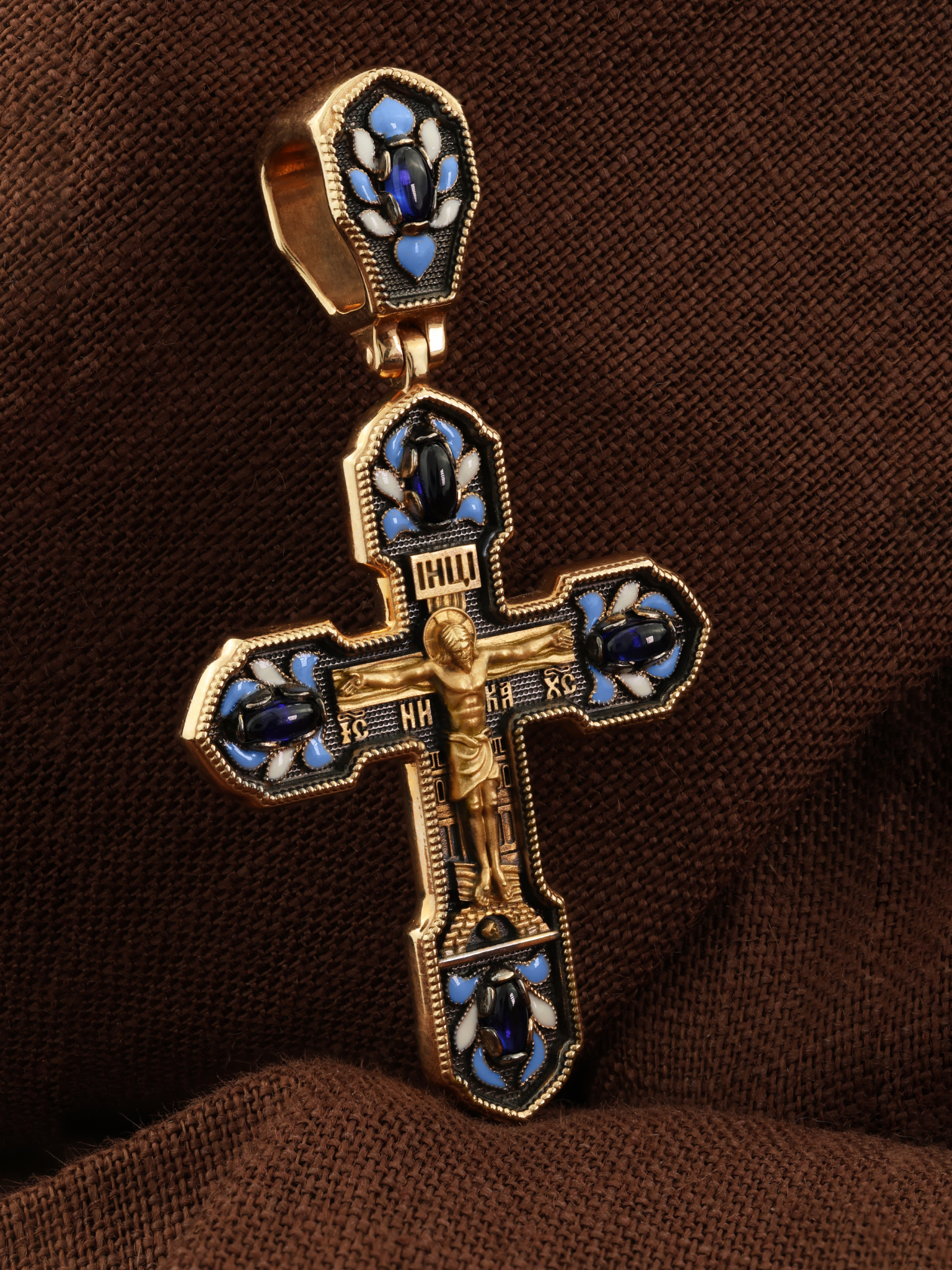 В верхней части Распятия у изголовья Иисуса Христа видна табличка с аббревиатурой «IНЦI» — «Иисус Назорей Царь Иудейский», которая, согласно Евангелию, была прибита к кресту после Его Распятия. Внизу, у подножия Господа, можно увидеть гору Голгофу с Главой Адамовой в пещере. Сам образ Распятия сопровождается каноническими надписями. Это святое имя Христа, которое принято писать на иконах сокращенно — «ИС ХС», словосочетание «СЫН БОЖИЙ», что означает божественную природу Иисуса Христа, и надпись «НИКА», обозначающая «победитель».