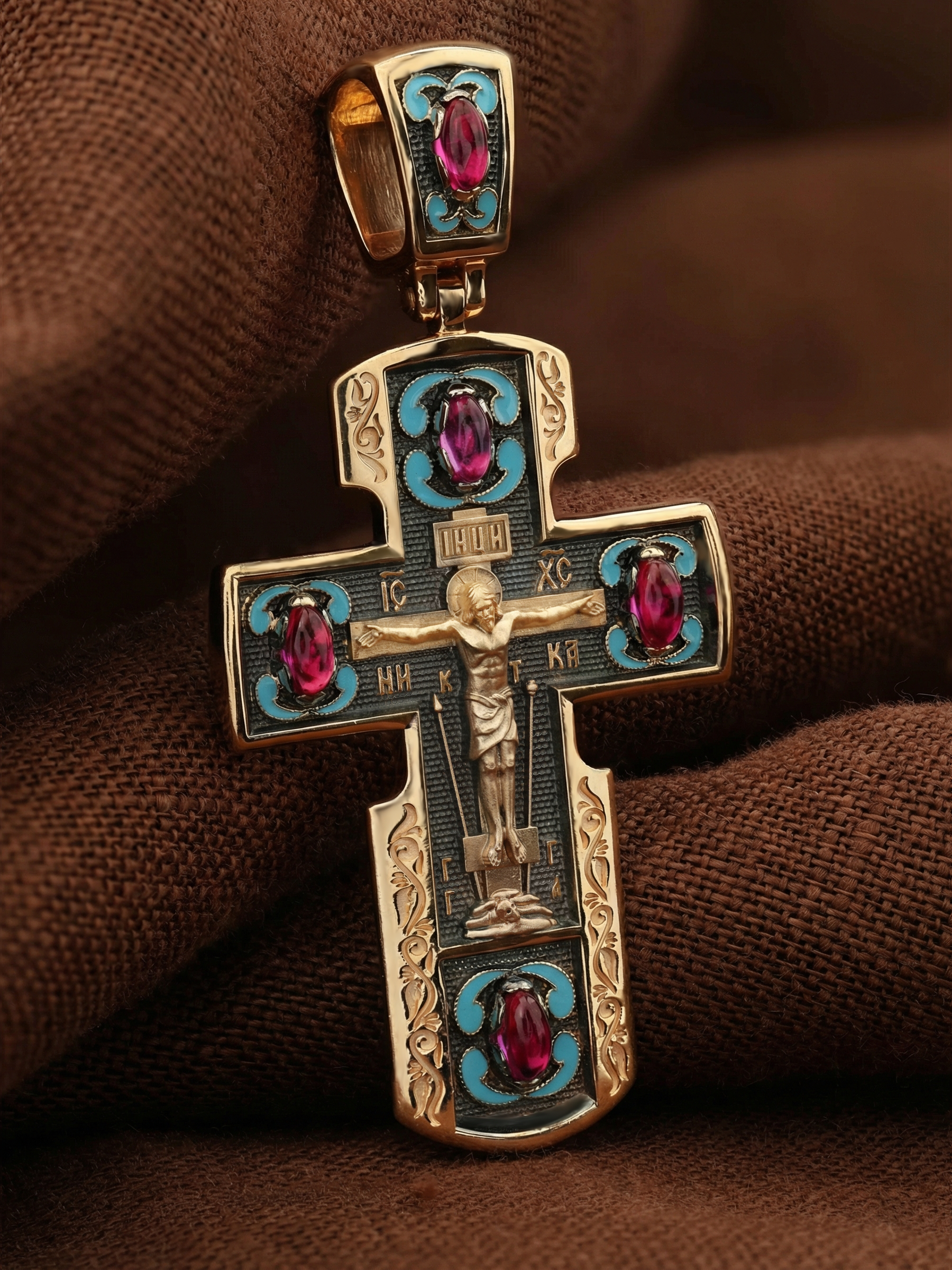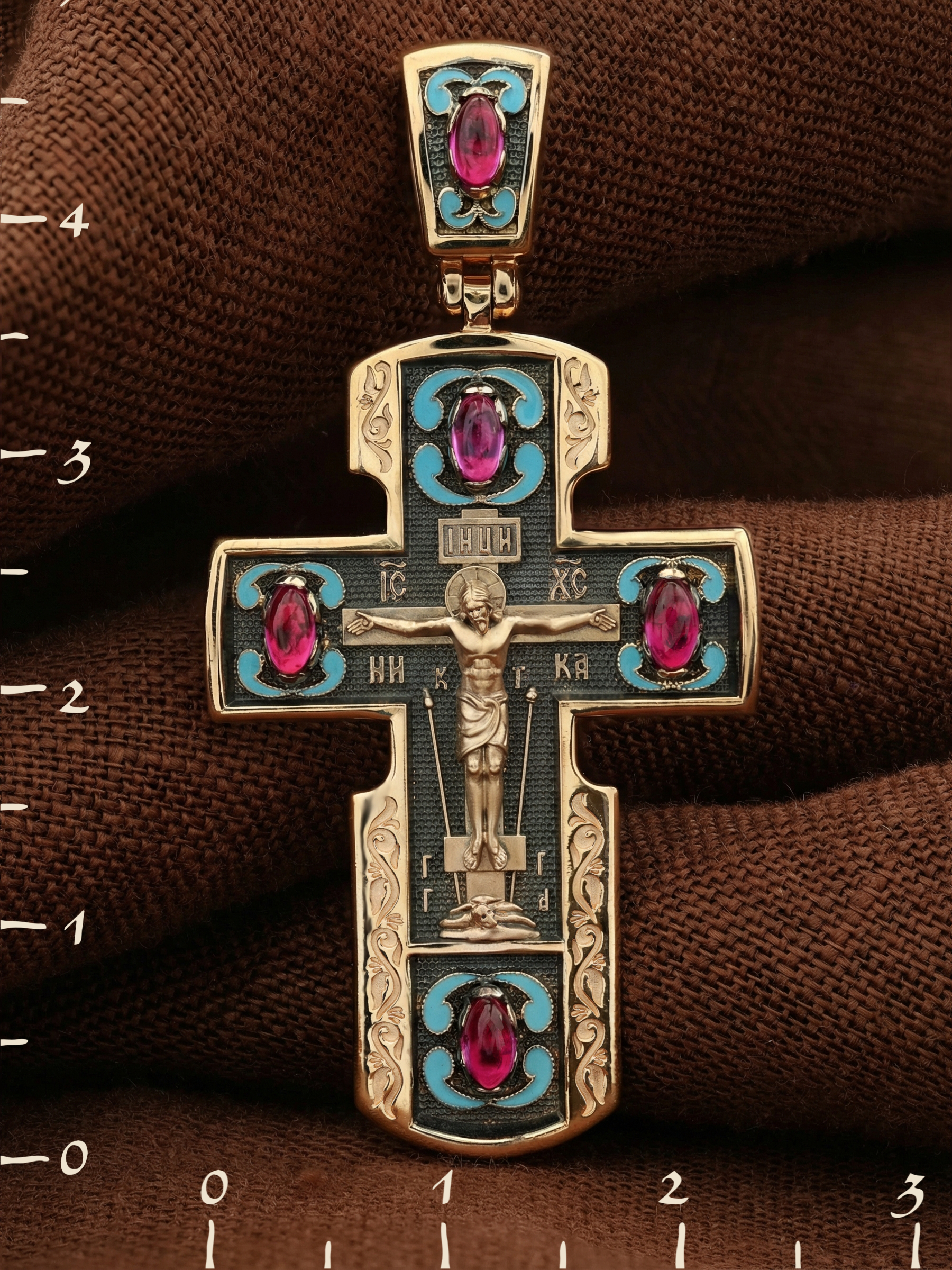 Крест из золота c эмаль и рубином
