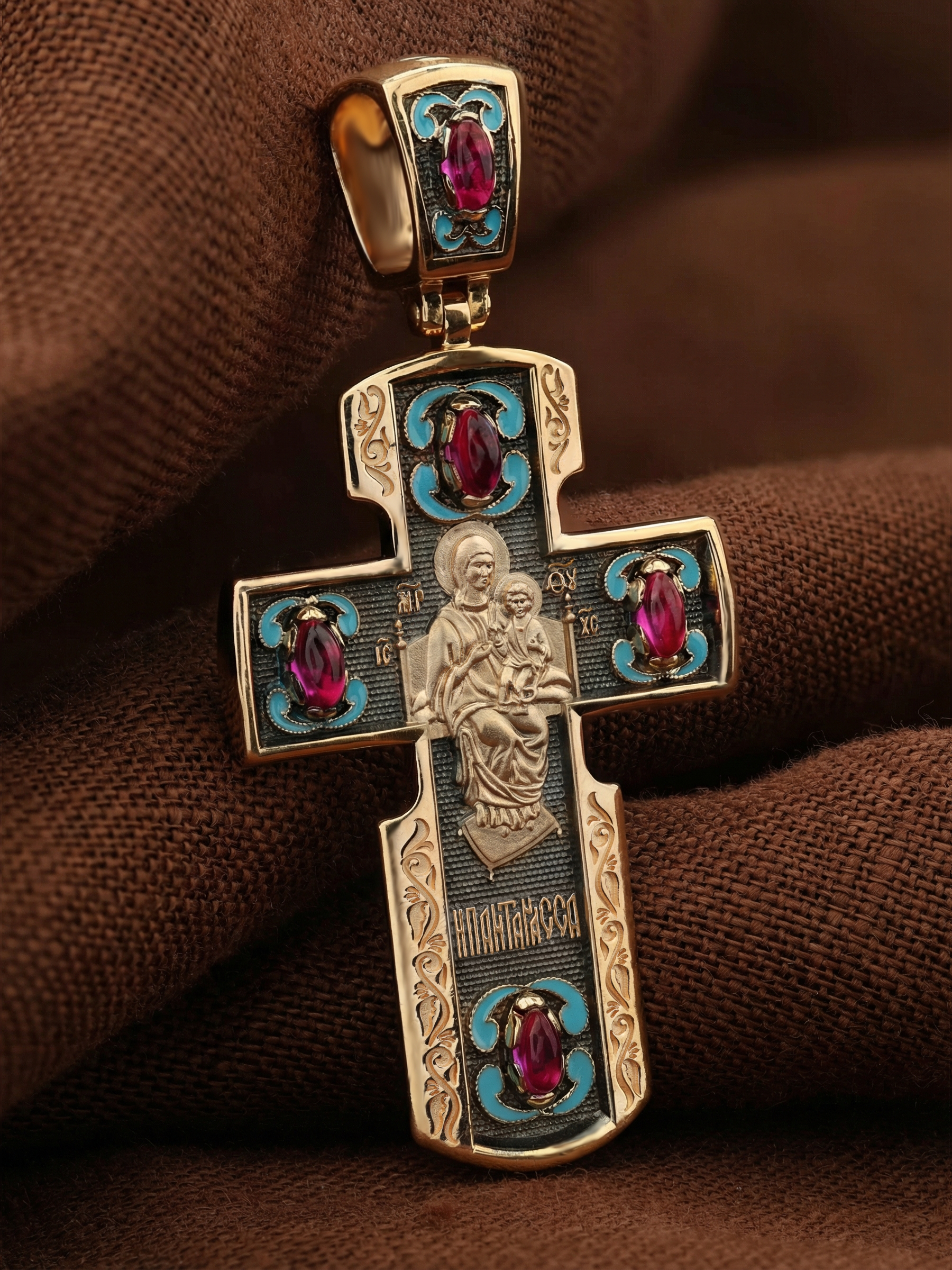 На оборотной стороне креста изображена икона Божией Матери «Всецарица» или «Пантанасса», на которой Пресвятая Богородица восседает на царском троне. На руках Ее — Богомладенец Христос со свитком в левой руке и благословляющий десницей. Правой рукой Богородица указывает на Своего Царственного Сына, как на Спасителя мира. Чудотворная икона была написана в XVII веке и находится на Святой Горе Афон, в одном из древних греческих монастырей — Ватопеде. По молитвам перед иконой совершается множество чудесных исцелений. Пречистая Богородица наставляет на праведный путь, помогает укрепить веру, найти утешение.