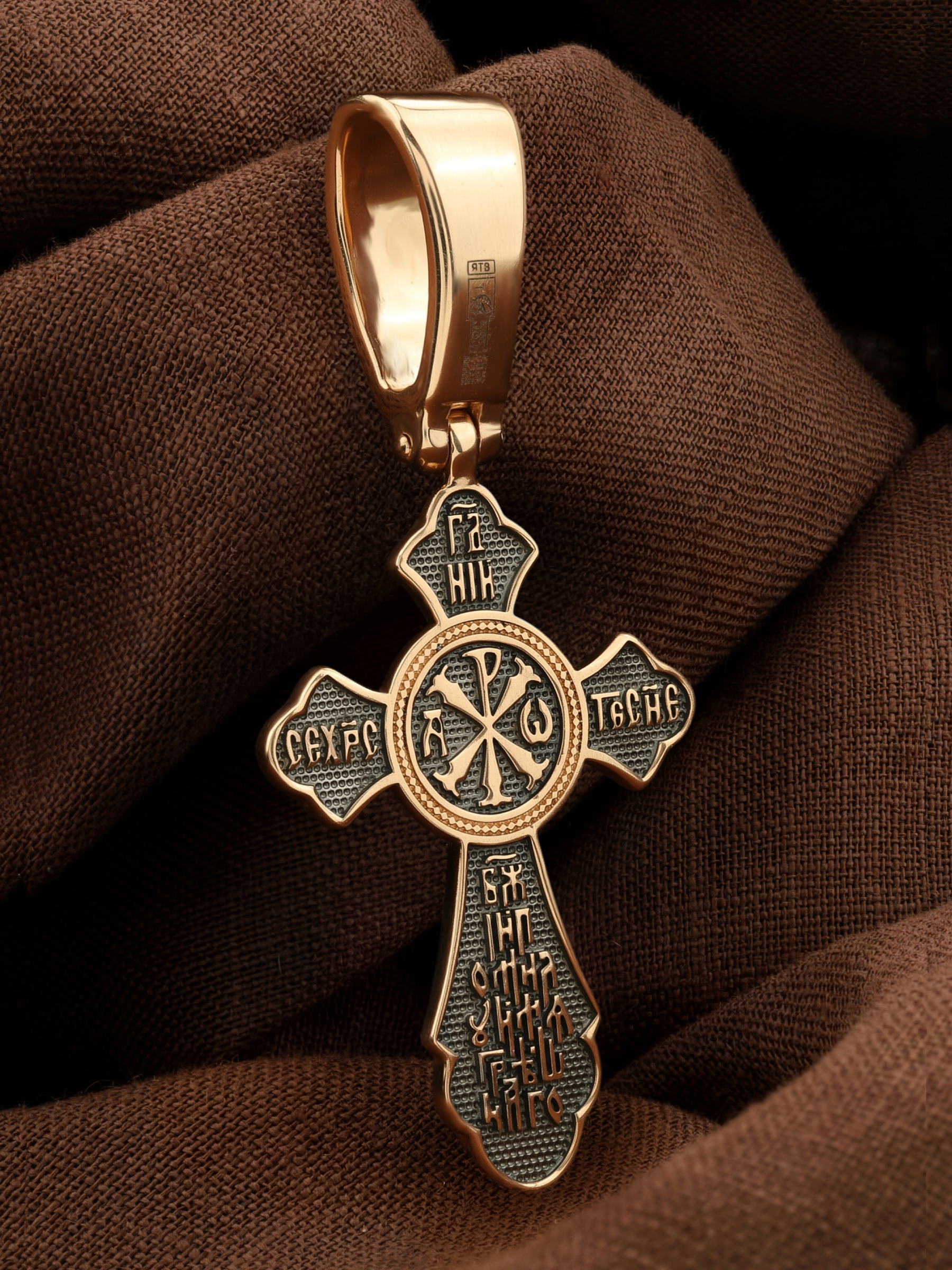 На лицевой стороне креста изображено Распятие, потому что это орудие казни Иисус Христос сделал орудием победы над грехом и смертью. Своими страданиями Он искупил грехи человечества, умерев и сошествовав во ад, победил сатану, освободил души праведников от вечной смерти и открыл им небесные врата рая. Жертва Христа сделала возможным спасение для каждого человека. На православном кресте Христос не умирает, а свободно простирает руки, ладони Иисуса открыты, будто он хочет обнять все человечество, даря им свою любовь и открывая путь к вечной жизни. Над титлом видим слова «ЦРЬ СЛВЫ» — Царь Славы. Верхняя перекладина символизирует собой табличку с надписью «IHЦI» — Иисус Назарянин Царь Иудейский. Над перекладиной пишется сокращенно имя Спасителя «IC XC» — Иисус Христос. В нижней части располагается надпись «НИКА» (греч. — Победитель). Возвышение, на котором стоит Крест, символизирует гору Голгофу, на которой произошло Распятие. У подножия Креста изображают прах Адама, обозначенный черепом.
