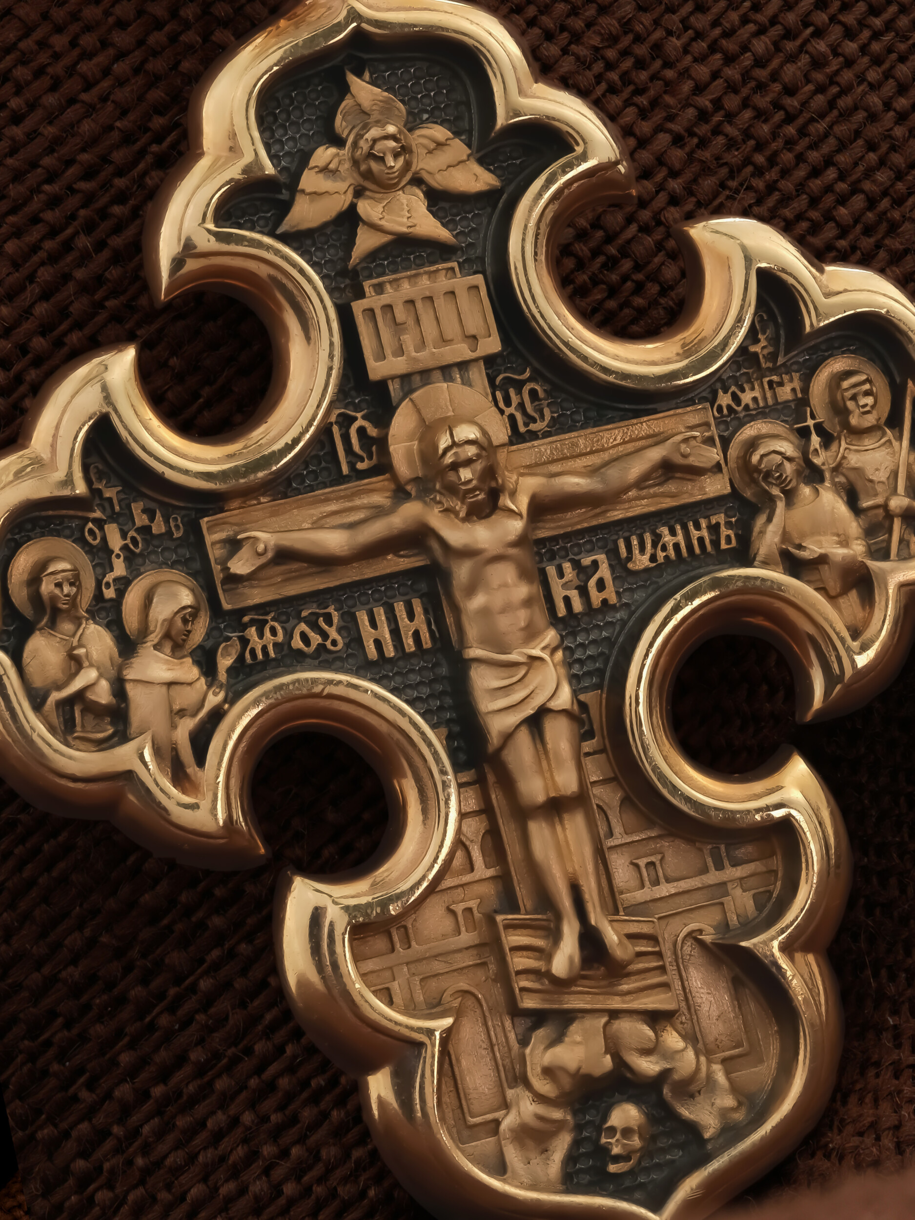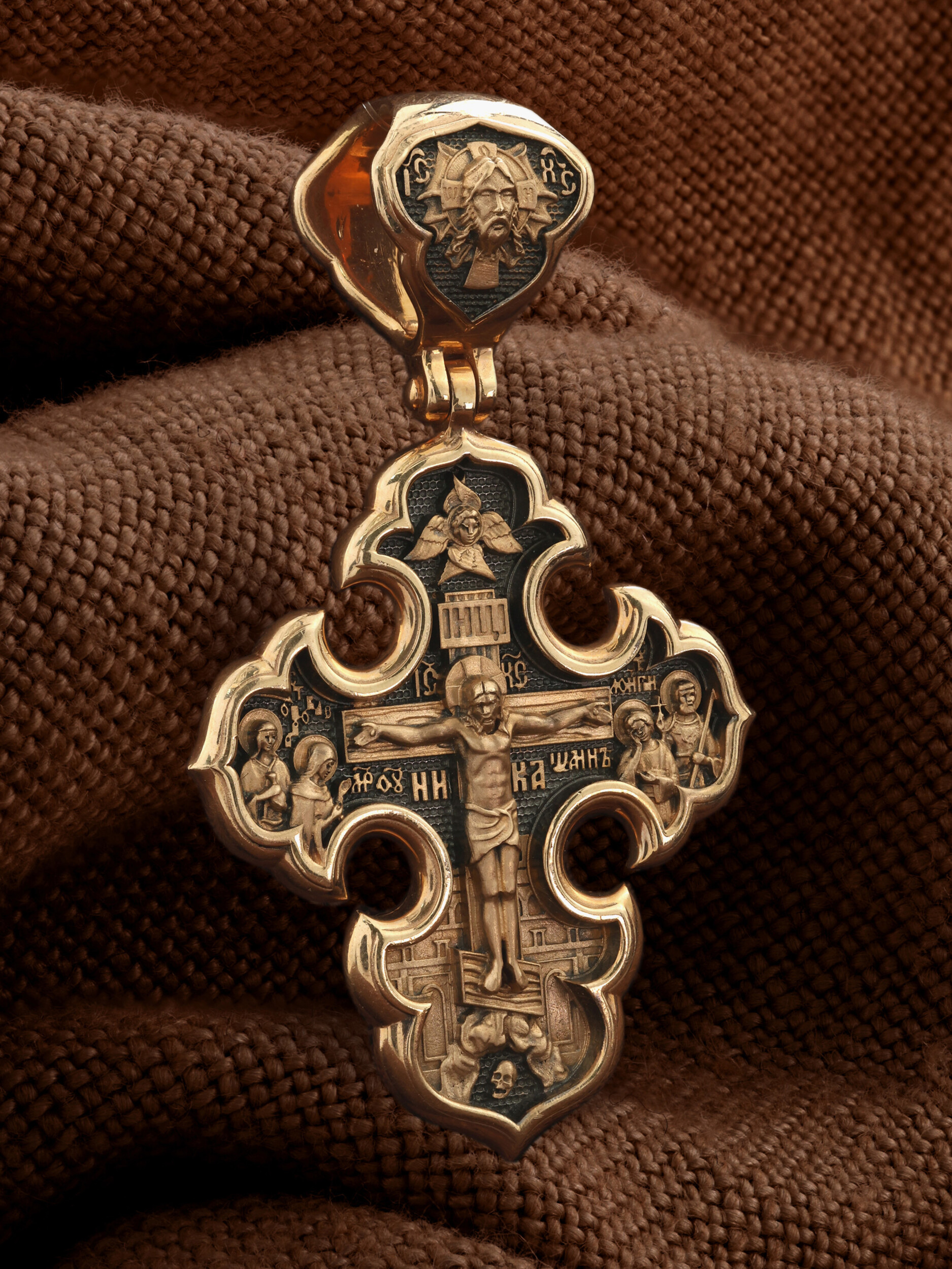 На лицевой стороне креста изображено Распятие Господа и Спасителя нашего Иисуса Христа. Своими крестными страданиями Господь смыл наши грехи, покрыл наш долг перед Богом или, на языке Писания, нас «искупил». В Голгофе сокрыта непостижимая тайна бесконечной правды и любви Бога. Крест стал символом победы добра над злом, жизни над смертью, напоминанием бесконечной Божьей любви, предметом радости. Воплотившийся Сын Божий Своею кровью освятил крест и сделал его проводником Своей благодати, источником освящения верующих. На верхней табличке, выше головы Иисуса, расположена надпись, составленная Понтием Пилатом — «IНЦI». Она означает «Иисус Назорей, Царь Иудейский». Ниже перекладины написано сокращенно имя Спасителя «IC» «XC» — Иисус Христос. Крест стоит на горе камней, символизирующих Голгофу. Под подножием Креста изображена покоящаяся голова (череп) Адама. Слева от Распятия стоят оплакивающие Господа Пресвятая Богородица и святая мироносица Мария Клеопова. Справа — апостол и евангелист Иоанн Богослов, один из ближайших учеников Иисуса Христа и сотник Лонгин с крестом в правой руке и копьем — в левой. По преданию, увидя, что они горько плачут, Иисус сказал Матери Своей: «Жено! Се сын Твой!» Потом сказал ученику Иоанну: «Се мати твоя». С этого времени Иоанн взял Матерь Божию к себе, и Она жила в его доме до самой смерти. На кулонном кольце изображен Спас Нерукотворный — образ Господа и Спасителя нашего Иисуса Христа, чудесно отпечатавшийся на плате, которым Христос вытер свой лик.