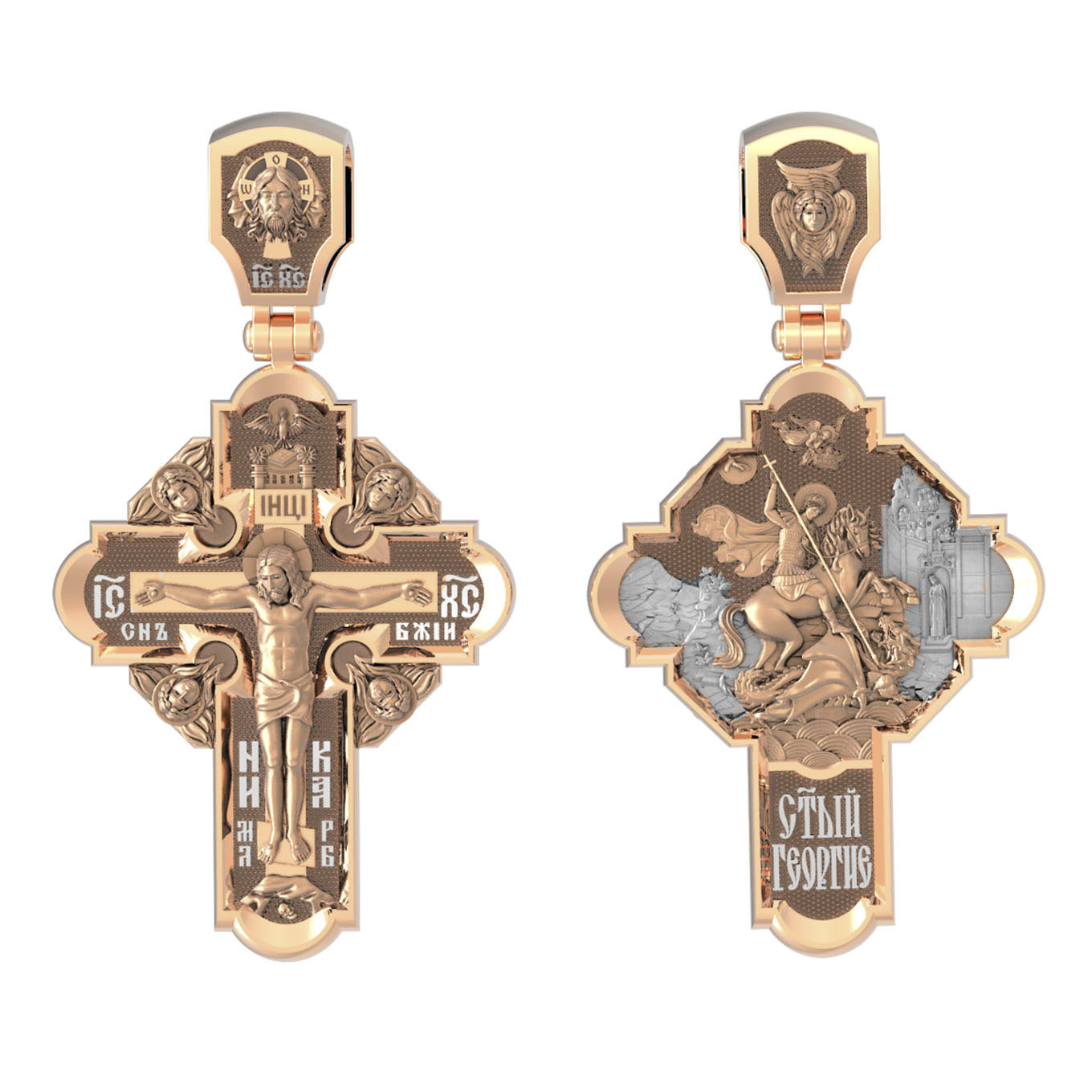 На оборотной стороне креста помещено изображение Святого Великомученика Георгия Победоносца — одного из самых почитаемых и удивительных святых. Георгий родился в Каппадокии (Малая Азия) в семье богатых и знатных горожан. Юношей поступил на службу к римскому императору Диоклетиану, за отличное знание военного дела и проявленную в боях и походах храбрость был приближен к императору и удостоен высокого воинского звания. Во время начавшихся гонений на христиан, перешел на сторону гонимых и, отвергнув человеческий страх, стал ярым проповедником учения Христа. Мучители подвергли опального воеводу жесточайшим восьмидневным пыткам и казнили его (обезглавили) в возрасте около тридцати лет в 303 году. Георгий изображен как воитель, сидящий на вздыбленном коне и поражающий копьем огнедышащего змея. Слева над образом изображена благословляющая Божия десница. Над святым изображен ангел возлагающий на него венец мученика. Змей символизирует собою сатанинские силы. Молитвами вознесенными к Всевышнему и своей непреклонной верой он смог одолеть чудовище. Святой убил змея, спас царскую дочь, принесенную в жертву, и жителей города, их души от влияния дьявола, породив в них надежду и веру в Господа, призывая людей принять христианскую веру. На кулонном кольце изображен шестикрылый Ангел — Серафим.