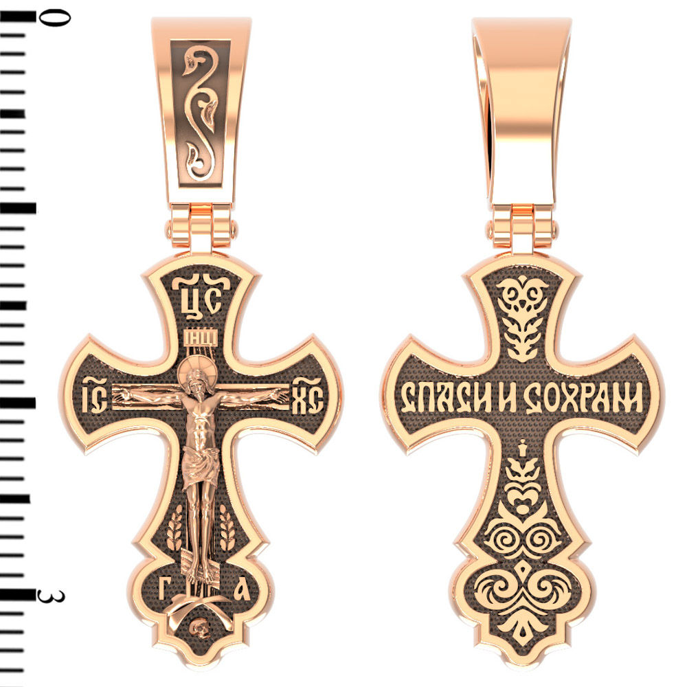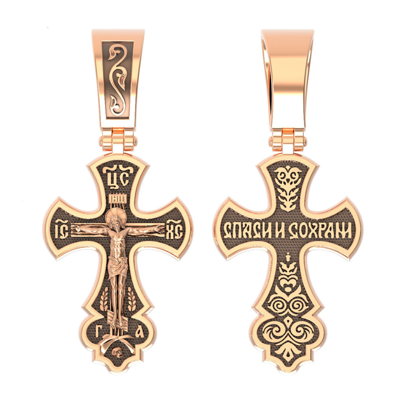 На лицевой стороне креста изображено Распятие, потому что это орудие казни Иисус Христос сделал орудием победы над грехом и смертью. Своими страданиями Он искупил грехи человечества, умерев и сошествовав во ад, победил сатану, освободил души праведников от вечной смерти и открыл им небесные врата рая. Жертва Христа сделала возможным спасение для каждого человека. На православном кресте Христос не умирает, а свободно простирает руки, ладони Иисуса открыты, будто он хочет обнять все человечество, даря им свою любовь и открывая путь к вечной жизни. Над титлом видим буквы «Ц» «С» — Царь Славы. Верхняя перекладина символизирует собой табличку с надписью «IHЦI» — Иисус Назарянин Царь Иудейский. По бокам поперечной перекладины сокращенно написано святое имя Христа «IС ХС». Буквы «Г» и «А» обозначают «Голова Адама». Возвышение, на котором стоит Крест, символизирует гору Голгофу, на которой произошло Распятие. У подножия Креста изображают прах Адама, обозначенный черепом.