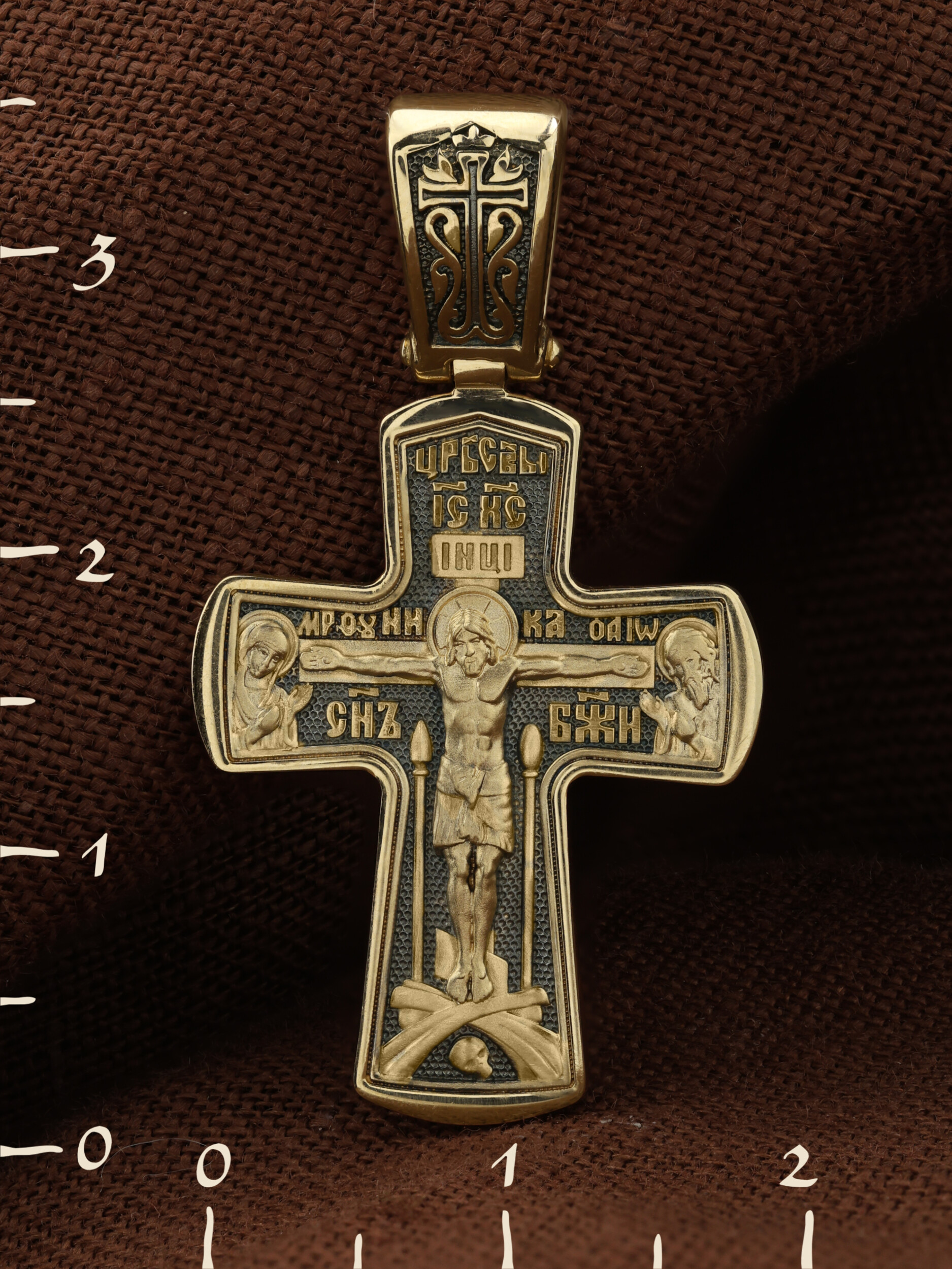 На лицевой стороне креста изображено Распятие Господа и Спасителя нашего Иисуса Христа, отдавшего Себя на смерть, для искупления грехов мира. Крест является символом жертвенной любви Всеблагого Бога к падшим людям, всепобеждающим духовным оружием христиан, основанием и средоточием церковной жизни. Господь сказал: «кто хочет идти за Мною, отвергнись себя, и возьми крест свой, и следуй за Мною». (Мк. 8: 34). На кулонном кольце изображен процветший крест. На верхней табличке, выше головы Иисуса, расположена надпись, составленная Понтием Пилатом — «IНЦI». Она означает «Иисус Назорей, Царь Иудейский». Распятие сопровождается каноническими надписями. Выше Распятия помещена надпись «Царь Славы» и надпись «IC» «ХC», означает Иисус Христос. Слово «НИКА», что означает «победитель» и надпись «Сын Божий», что означает божественную природу Иисуса Христа, помещаются на разных сторонах поперечной перекладины креста. Слева от Распятия изображена Пресвятая Богородица, справа — Про¬рок Предтеча и Креститель Господень Иоанн. Вдоль креста помещены Орудия Страстей Господних — копие сотника Лонгина и трость с губкой. Крест стоит на горе камней, символизирующих Голгофу. В ее основании различается череп– это голова Адама. На православном кресте Христос не умирает, а свободно простирает руки, ладони Иисуса открыты, будто он хочет обнять все человечество, даря им свою любовь и открывая путь к вечной жизни.