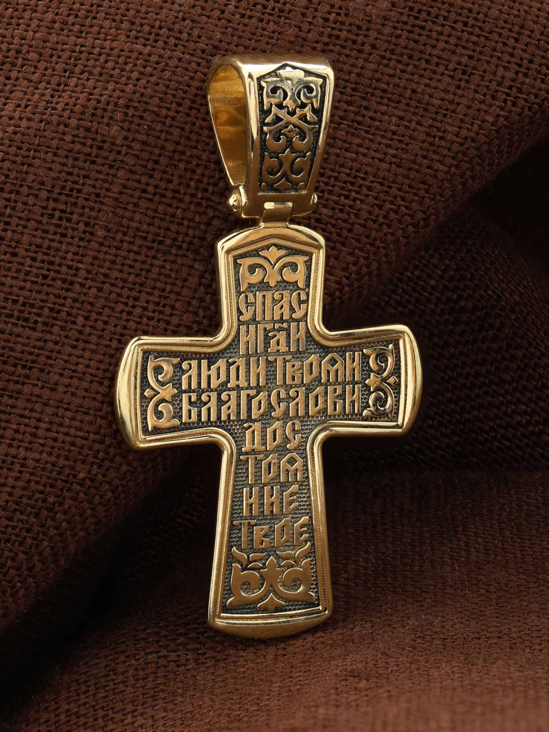 На оборотной стороне креста написан начальный стих тропаря Животворящему Кресту Господню: «Спаси, Господи, люди Твоя и благослови достояние твое…».