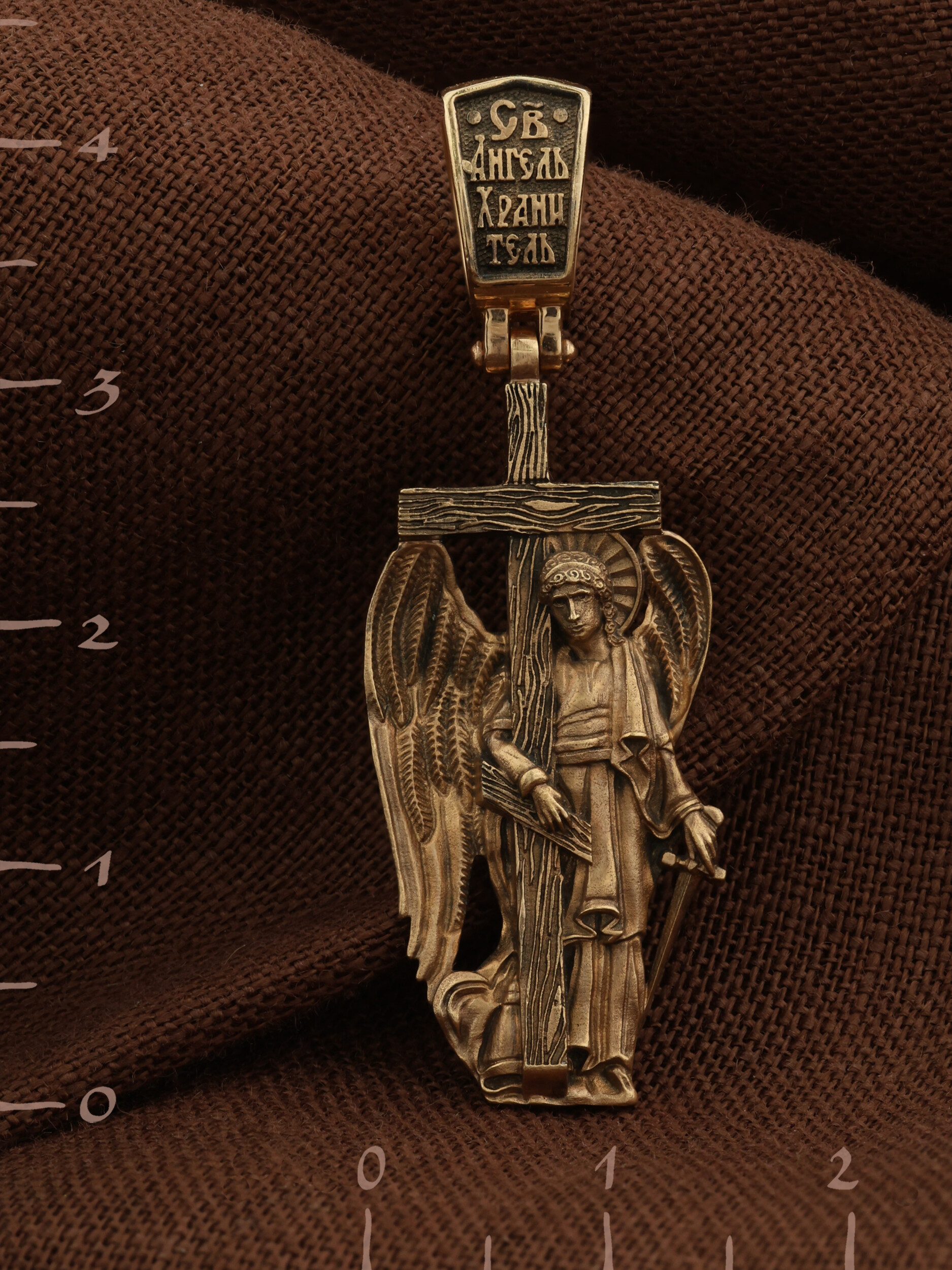 Основой композиции является изображение Святого Ангела-Хранителя держащего в правой руке крест, а в левой — мечь. Крест является символом жертвенной любви всеблагого Бога к падшим людям, всепобеждающим духовным оружием христиан, основанием и средоточием церковной жизни. Господь сказал: «кто хочет идти за Мною, отвергнись себя, и возьми крест свой, и следуй за Мною». (Мк. 8: 34). Ангел-Хранитель — это Ангел приставляемый Богом к человеку при крещении для охраны и помощи в добрых делах. Он невидимо находится при человеке на протяжении всей его жизни, если человек сохраняет в себе любовь к Богу и истинную веру перед Ним. Ангел-Xранитель делают для нас все, что служит к истинному нашему благу и спасению. Невидимо пребывая при нас постоянно, он, руководствуя нас ко спасению, не только по нашему желанию таинственно наставляет нас на все доброе и полезное, не только возносит наши молитвы к Богу, но еще и сам от себя охраняют и защищают нас от врагов видимых и невидимых и ходатайствует за нас пред Богом. Ангел-Хранитель так любит нас, как никто на земле любить не может. Ангел-Хранитель — присный друг наш, незримый тихий собеседник, пресладостный утешитель.