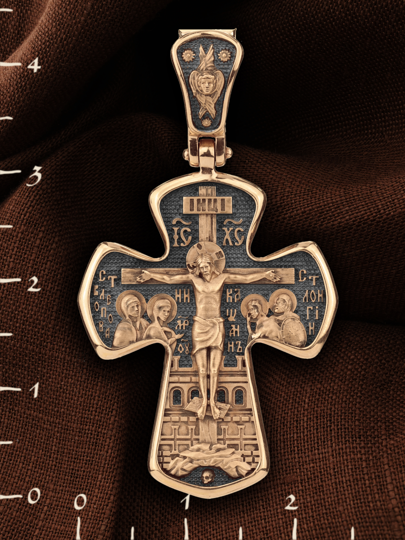 На лицевой стороне креста изображено Распятие Господа и Спасителя нашего Иисуса Христа, отдавшего Себя на смерть, для искупления грехов мира. Господь сказал: кто хочет идти за Мною, отвергнись себя, и возьми крест свой, и следуй за Мною. (Мк. 8: 34). Крест является символом жертвенной любви всеблагого Бога к падшим людям, всепобеждающим духовным оружием христиан, основанием и средоточием церковной жизни. На верхней перекладине помещена надпись «IС» « ХС», что означает Иисус Христос. Ниже — слово «НИКА», что означает «победитель». Слева от Распятия изображена Пресвятая Богородица, справа — апостол и евангелист Иоанн Богослов, один из ближайших учеников Иисуса Христа. За Распятием высится Иерусалимская стена, в знак того, что Господь был распят вне стен города. Возвышение, на котором стоит Крест, символизирует гору Голгофу, на которой произошло Распятие. Под подножием Креста изображена покоящаяся голова (череп) Адама. На кулонном кольце помещен крест.