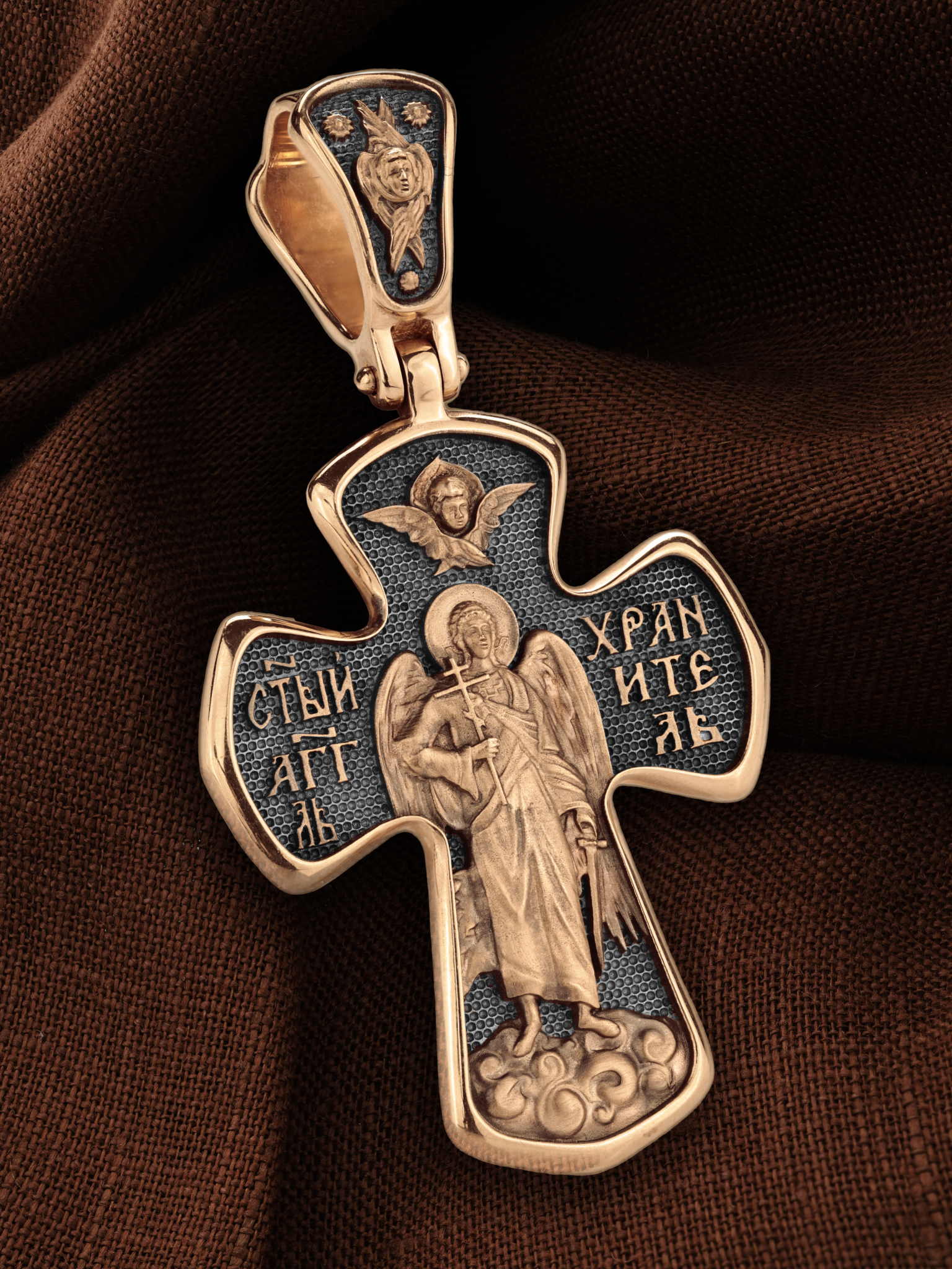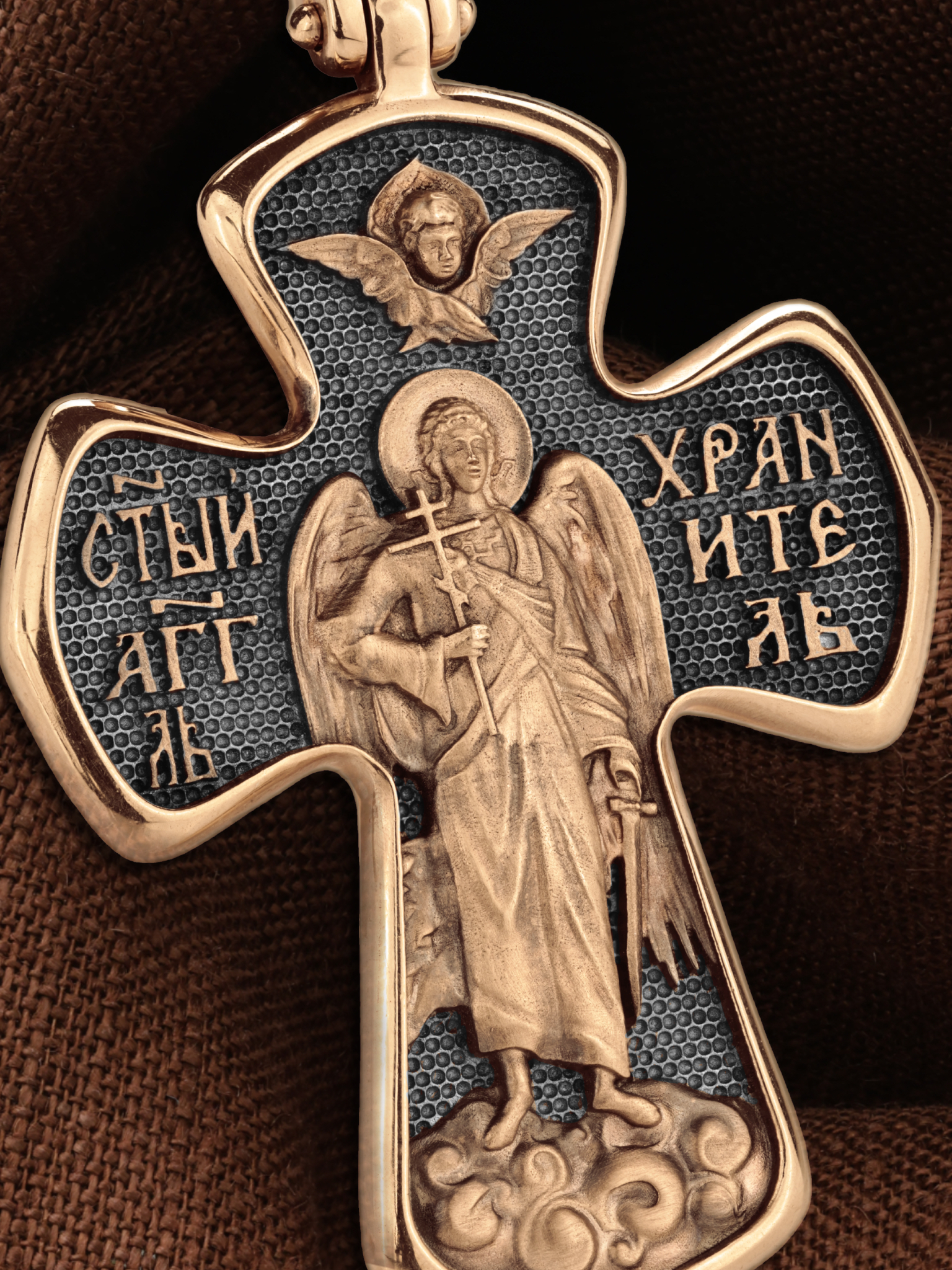 На оборотной стороне креста изображен Святой Ангел-Хранитель держащего в правой руке крест, а в левой — мечь. Ангел-Хранитель — это Ангел приставляемый Богом к человеку при крещении для охраны и помощи в добрых делах. Он невидимо находится при человеке на протяжении всей его жизни, если человек сохраняет в себе любовь к Богу и истинную веру перед Ним. Ангел-Xранитель делают для нас все, что служит к истинному нашему благу и спасению. Невидимо пребывая при нас постоянно, он, руководствуя нас ко спасению, не только по нашему желанию таинственно наставляет нас на все доброе и полезное, не только возносит наши молитвы к Богу, но еще и сам от себя охраняют и защищают нас от врагов видимых и невидимых и ходатайствует за нас пред Богом. Одного лишь каждому из нас он желает — спасения души; к этому он направляет все свои заботы. Над образом помещен Серафим.