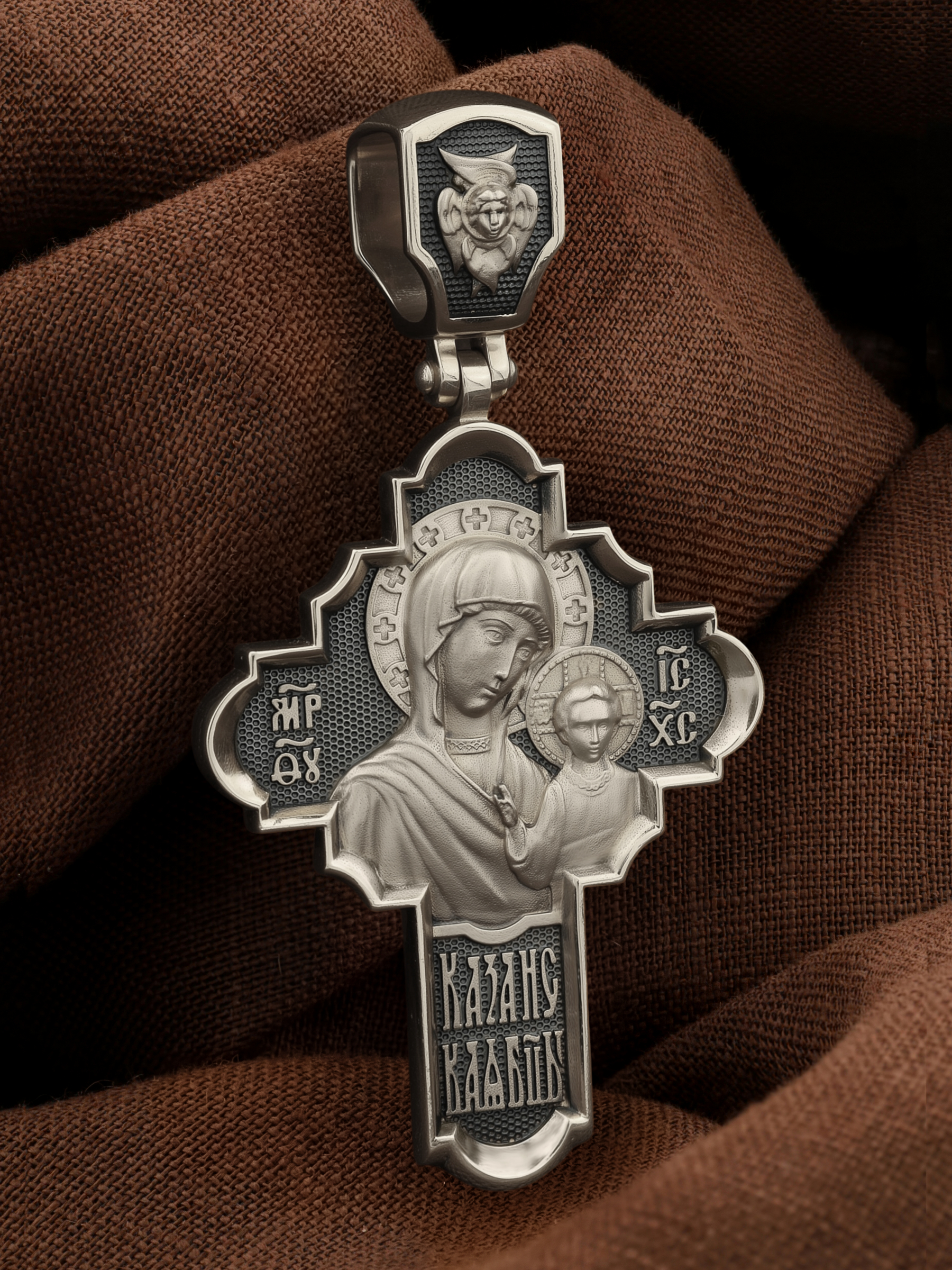 На оборотной стороне креста изображена Казанская икона Божией Матери. Пресвятая Богородица — милосердная заступница, просительница за нас перед Богом. Она стала воистину нашей Матушкой, охраняющей и поддерживающей нас от рождения до самой смерти, а Ее благодатная помощь изливается на нас по молитвам у ее чудотворных икон. Казанская икона явилась в 1579 году в Казани, вскоре после взятия Казанского царства у татар Иоанном Грозным. Этот образ Богородицы не раз сопровождал русский народ в бедствиях. Икона Божией Матери Казанская вдохновляла русских ратников в период Смутного времени при освобождении Москвы от поляков. Перед Казанской иконой в 1709 году, накануне Полтавской победы, император Петр I молился о даровании победы русскому войску. В 1812 году накануне отъезда в действующую армию перед чудотворной иконой Божией Матери молился князь Михаил Кутузов. Не только государственным мужам и дружинам указывала путь икона — по доброй традиции именно этой иконой благословляют на брак молодых родители, длинным списком чудес сопровождается этот образ Богоматери — один из самых любимых на Руси. Существует множество древних списков с этой удивительной иконы.