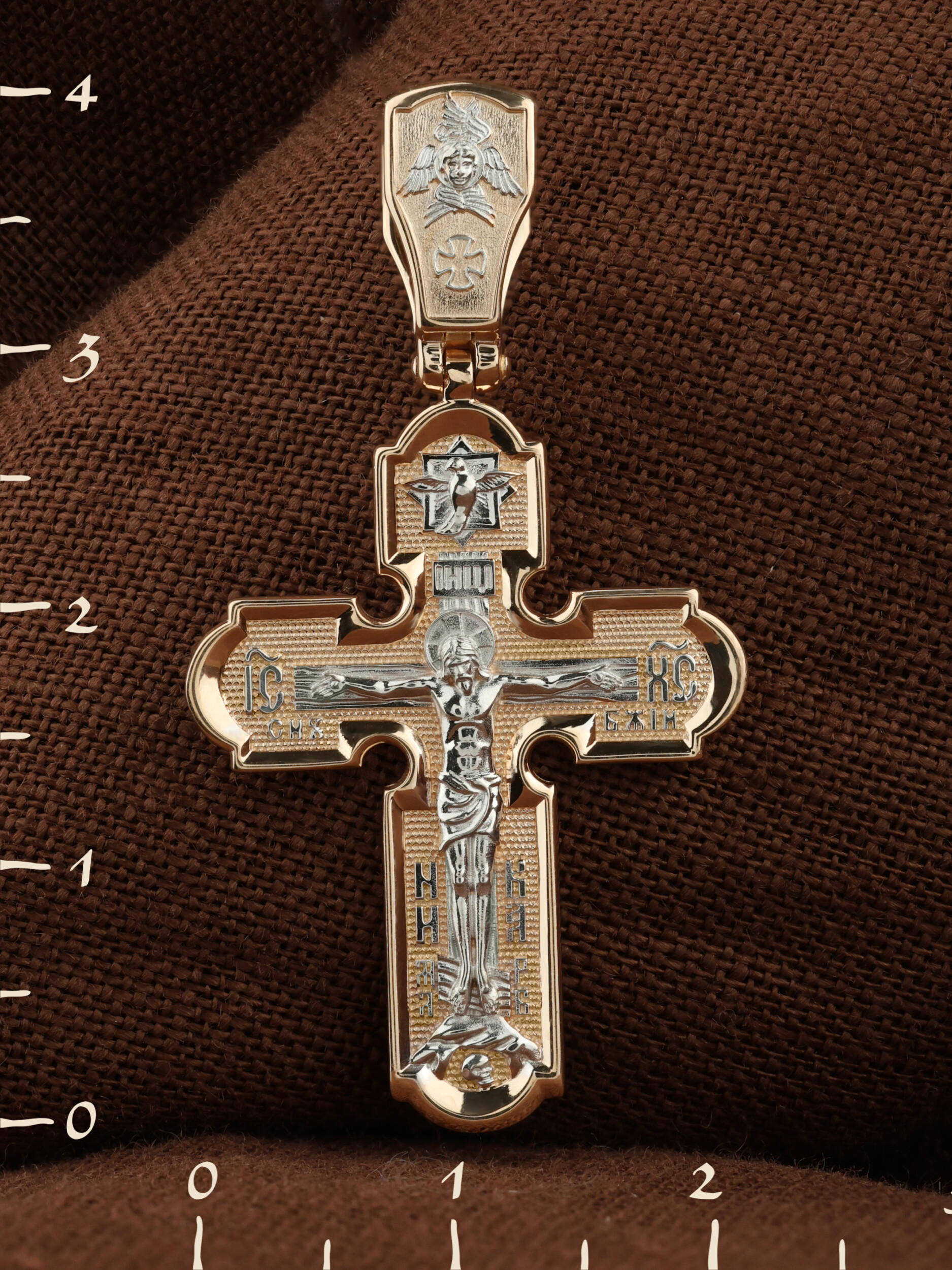 На лицевой стороне креста изображено Распятие Иисуса Христа. Господь представлен свободно покоящимся на кресте с простертыми руками и как бы обнимающим всю Вселенную. Верхняя перекладина символизирует титло — табличку, на которой, согласно Евангелию, было начертано: Иисус Назорей Царь Иудейский (IНЦI). Также Распятие сопровождается надписями, олицетворяющими Христа: святое имя Христа «IC» (Иисус) «ХС» (Христос), и словосочетание «СНЪ БЖIЙ» — СЫН БОЖИЙ. Рядом с образом Христа помещены слова — «НИКА» (греч. — Победитель) и четыре буквы «МЛ» «РБ» — Место Лобное Рай Бысть. Возвышение, на котором стоит Крест, символизирует гору Голгофу, на которой произошло Распятие. У подножия Креста изображают прах Адама, обозначенный черепом. На кулонном кольце изображен шестикрылый Серафим — самый приближенный к Господу Ангел.