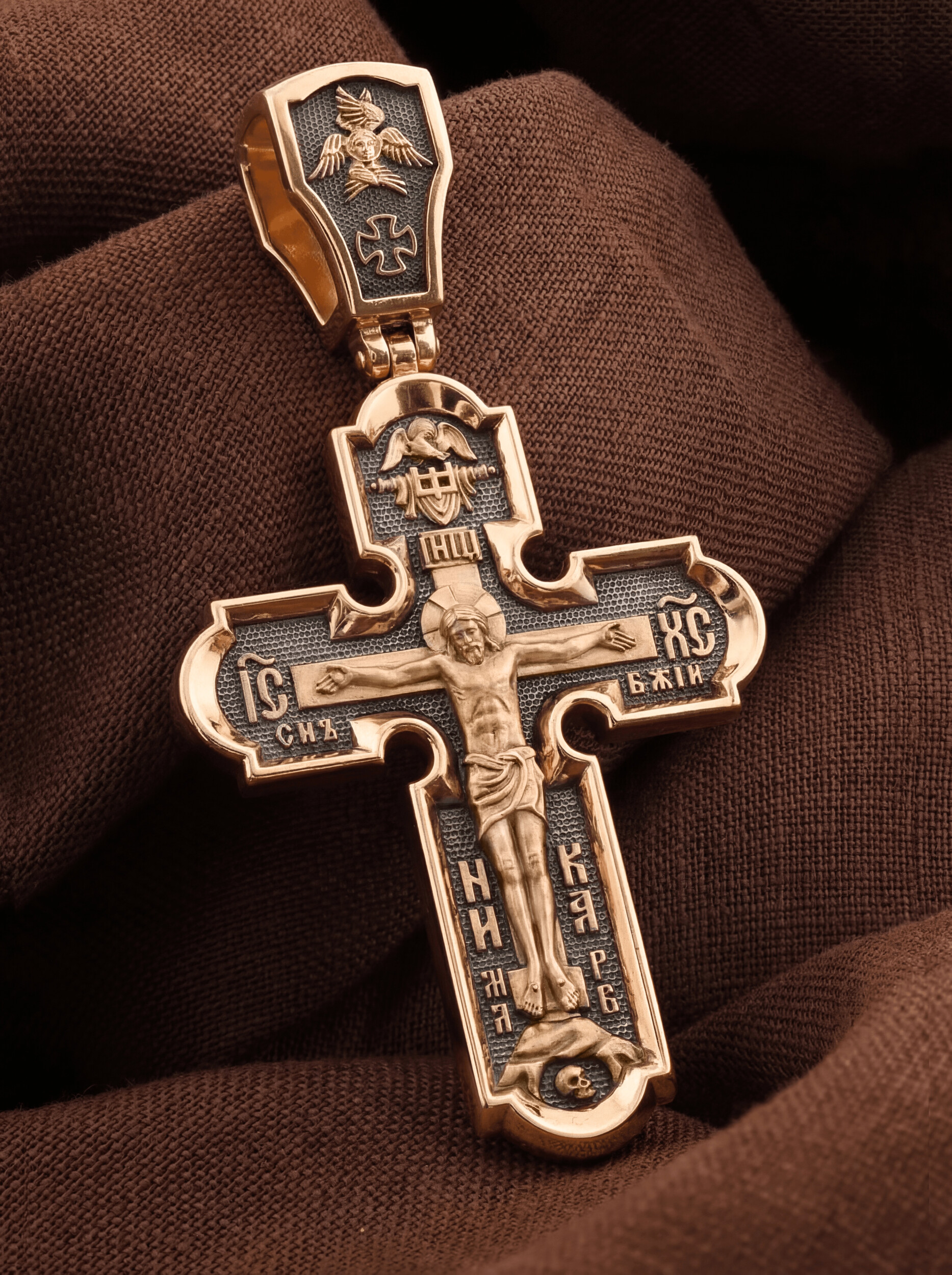 На лицевой стороне креста изображено Распятие Господа и Спасителя нашего Иисуса Христа. Христос, подвергнутый на кресте мучительной казни, своими страданиями искупил нас от древнего греха и даровал нам жизнь вечную. Без Распятия не было бы Воскресения Христова, и поэтому Крест из орудия казни обратился в святыню, в которой действует Благодать Божия. Над Распятием изображен Дух Святой в виде голубя, сходящего с Небес. Распятие сопровождается каноническими надписями. На верхней табличке, выше головы Иисуса, расположена надпись, составленная Понтием Пилатом на трех языках — «IНЦI». Она означает «Иисус Назорей, Царь Иудейский». Надпись «IС ХС» означает Иисус Христос и помещается на разных сторонах поперечной (большой) перекладины креста. Ниже — словосочетание «СЫН БОЖИЙ», что означает божественную природу Иисуса Христа. Крест стоит на горе камней, символизирующих Голгофу. В ее основании различается череп — это голова Адама. Надписи «Ника», что означает Победитель, и надпись «МЛРБ» — «место лобное рай бысть», что означает место лобное стало раем, размещены в нижней части креста. На кулонном кольце изображен шестикрылый Серафим.