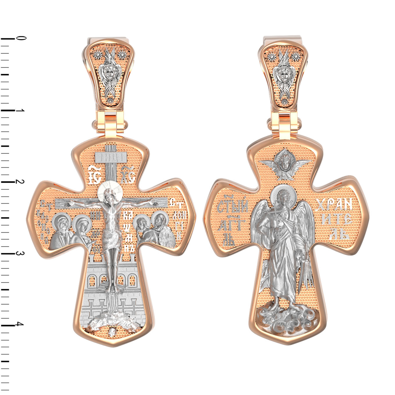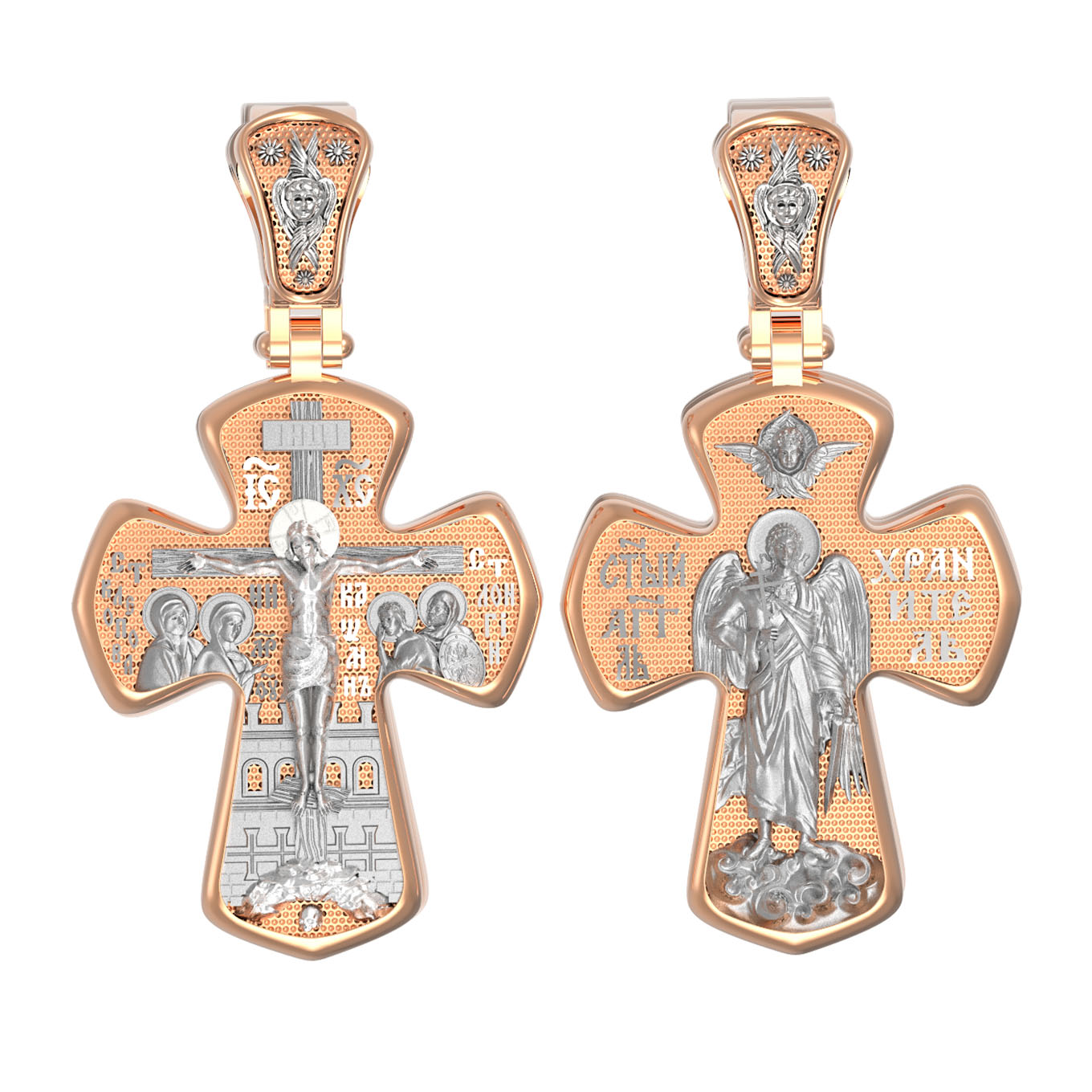 На лицевой стороне креста изображено Распятие Господа и Спасителя нашего Иисуса Христа, отдавшего Себя на смерть, для искупления грехов мира. Господь сказал: кто хочет идти за Мною, отвергнись себя, и возьми крест свой, и следуй за Мною. (Мк. 8: 34). Крест является символом жертвенной любви всеблагого Бога к падшим людям, всепобеждающим духовным оружием христиан, основанием и средоточием церковной жизни. На верхней перекладине помещена надпись «IС» « ХС», что означает Иисус Христос. Ниже — слово «НИКА», что означает «победитель». Слева от Распятия изображена Пресвятая Богородица, справа — апостол и евангелист Иоанн Богослов, один из ближайших учеников Иисуса Христа. За Распятием высится Иерусалимская стена, в знак того, что Господь был распят вне стен города. Возвышение, на котором стоит Крест, символизирует гору Голгофу, на которой произошло Распятие. Под подножием Креста изображена покоящаяся голова (череп) Адама. На кулонном кольце помещен крест.