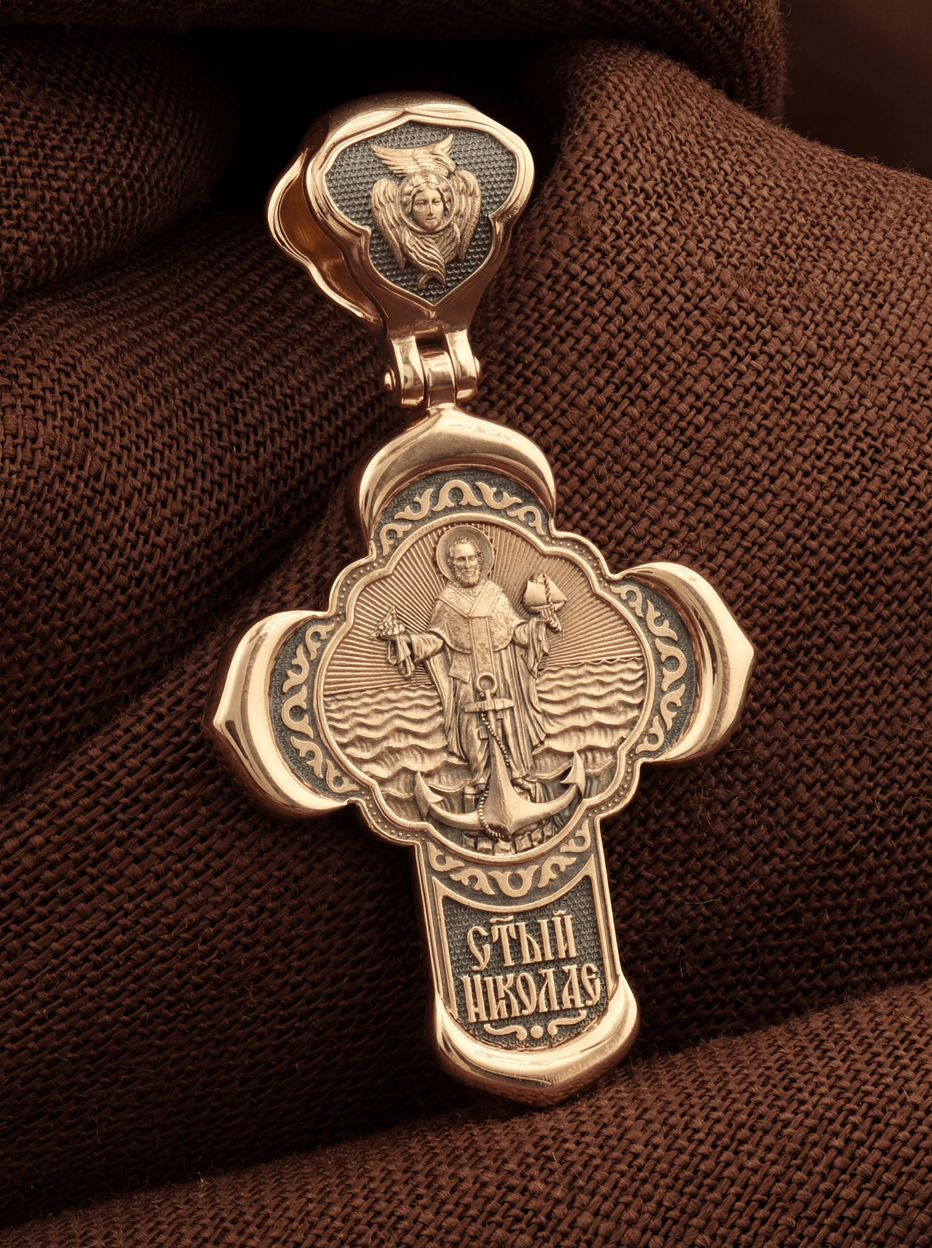 На лицевой стороне креста изображено Распятие Господа и Спасителя нашего Иисуса Христа, отдавшего Себя на смерть, для искупления грехов мира. Крест является символом жертвенной любви Всеблагого Бога к падшим людям, всепобеждающим духовным оружием христиан, основанием и средоточием церковной жизни. Господь сказал: «кто хочет идти за Мною, отвергнись себя, и возьми крест свой, и следуй за Мною». (Мк. 8: 34). На верхней табличке, выше головы Иисуса, расположена надпись, составленная Понтием Пилатом — «IНЦI». Она означает «Иисус Назорей, Царь Иудейский». Надпись «IC» «ХC», означает Иисус Христос, помещается на разных сторонах поперечной перекладины креста. Крест стоит на горе камней, символизирующих Голгофу. В ее основании различается череп– это голова Адама. На кулонном кольце изображен Нерукотворный образ Господа и Спасителя нашего Иисуса Христа, чудесно отпечатавшийся на плате, которым Христос вытер свой лик.