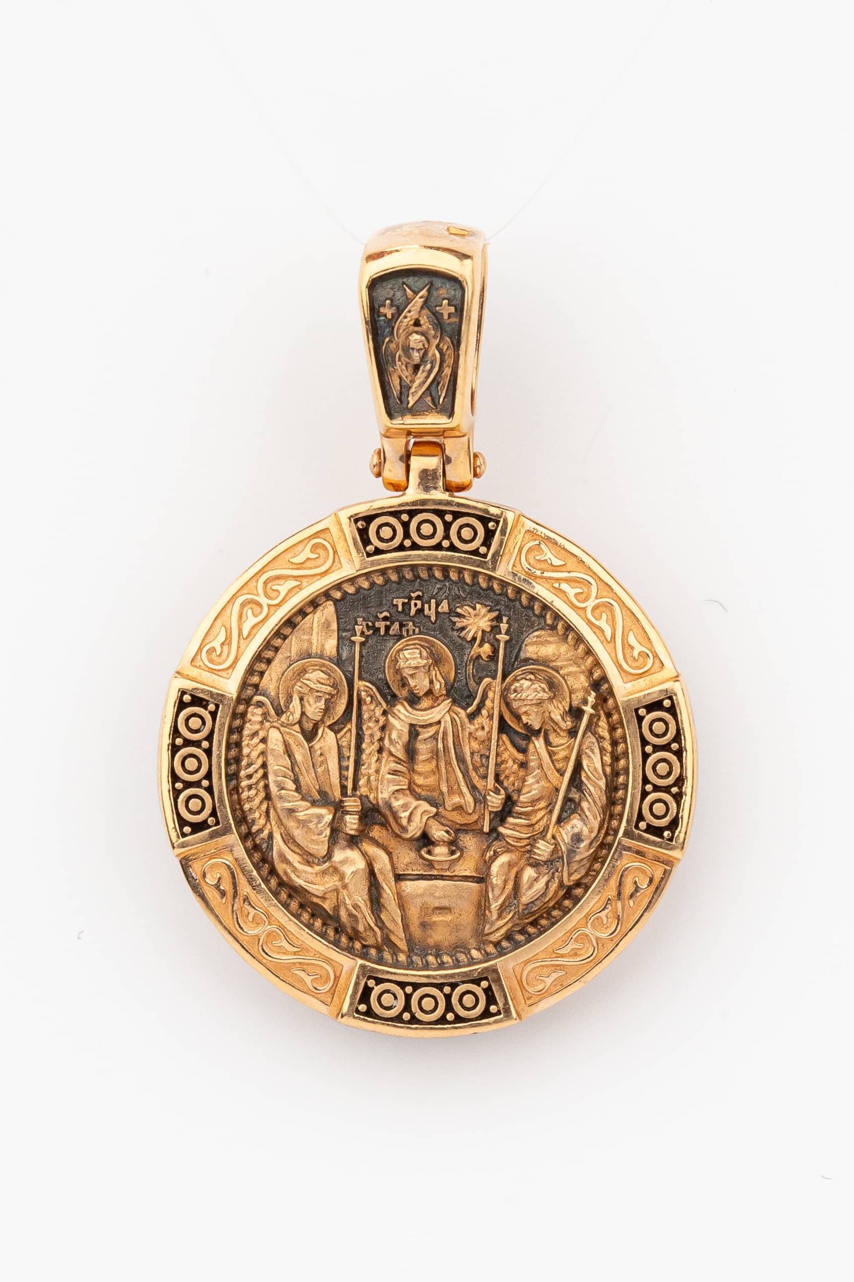На лицевой стороне изображена икона Святой Троицы. Это образ Триединого Бога явившегося в виде трех Ангелов праотцу Аврааму. Ангелы сидят за трапезным столом вокруг чаши, которая символизирует грядущую жертву Второго Лица Пресвятой Троицы, Бога Сына.