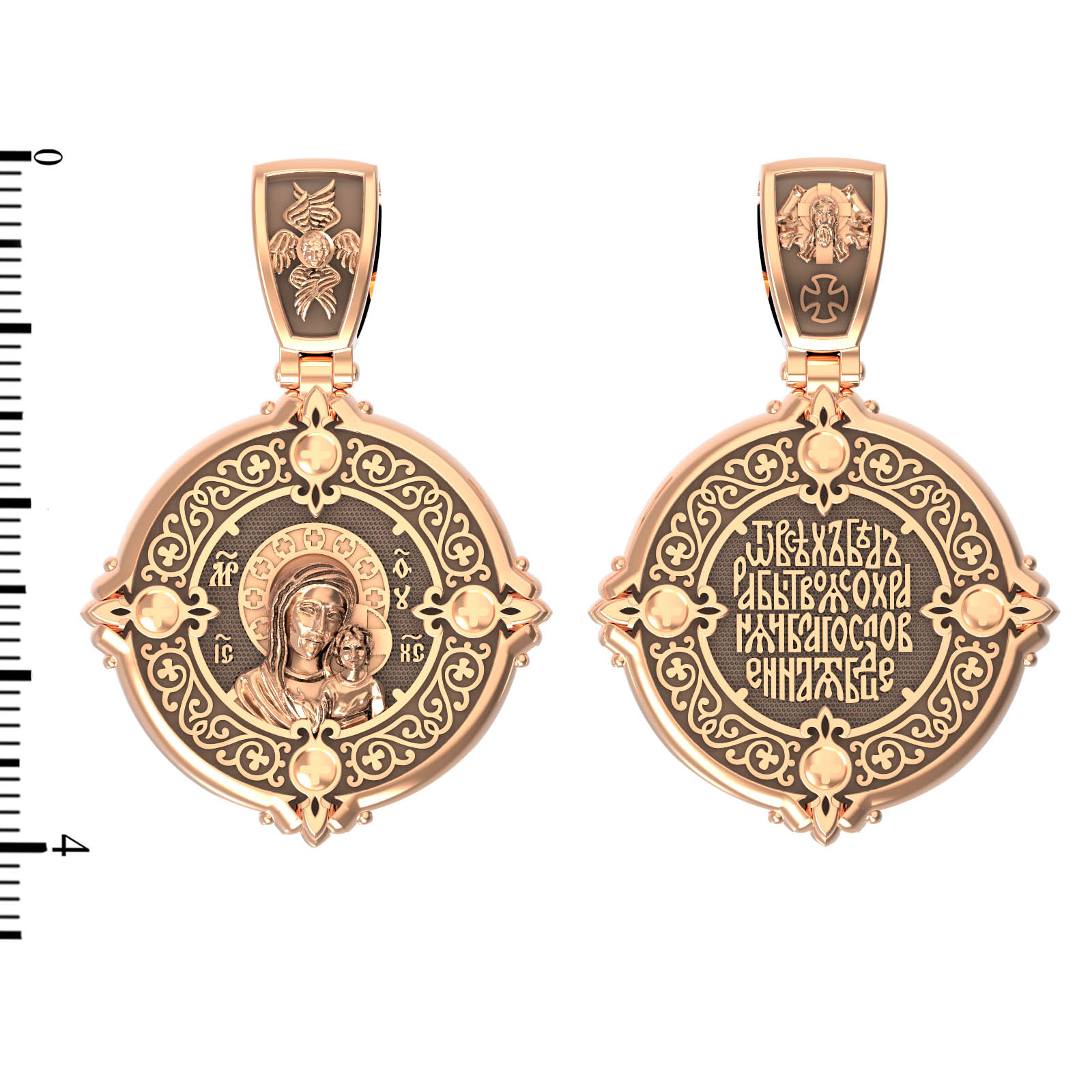 На обороте написана молитва к Богородице: «От всех бед рабы Твоя сохраняй, Благословенная Богородица!». На кулонном кольце изображен Спас Нерукотворный — Символ вочеловечившегося Божества и шестикрылый Серафим — самый приближенный к Господу Ангел.