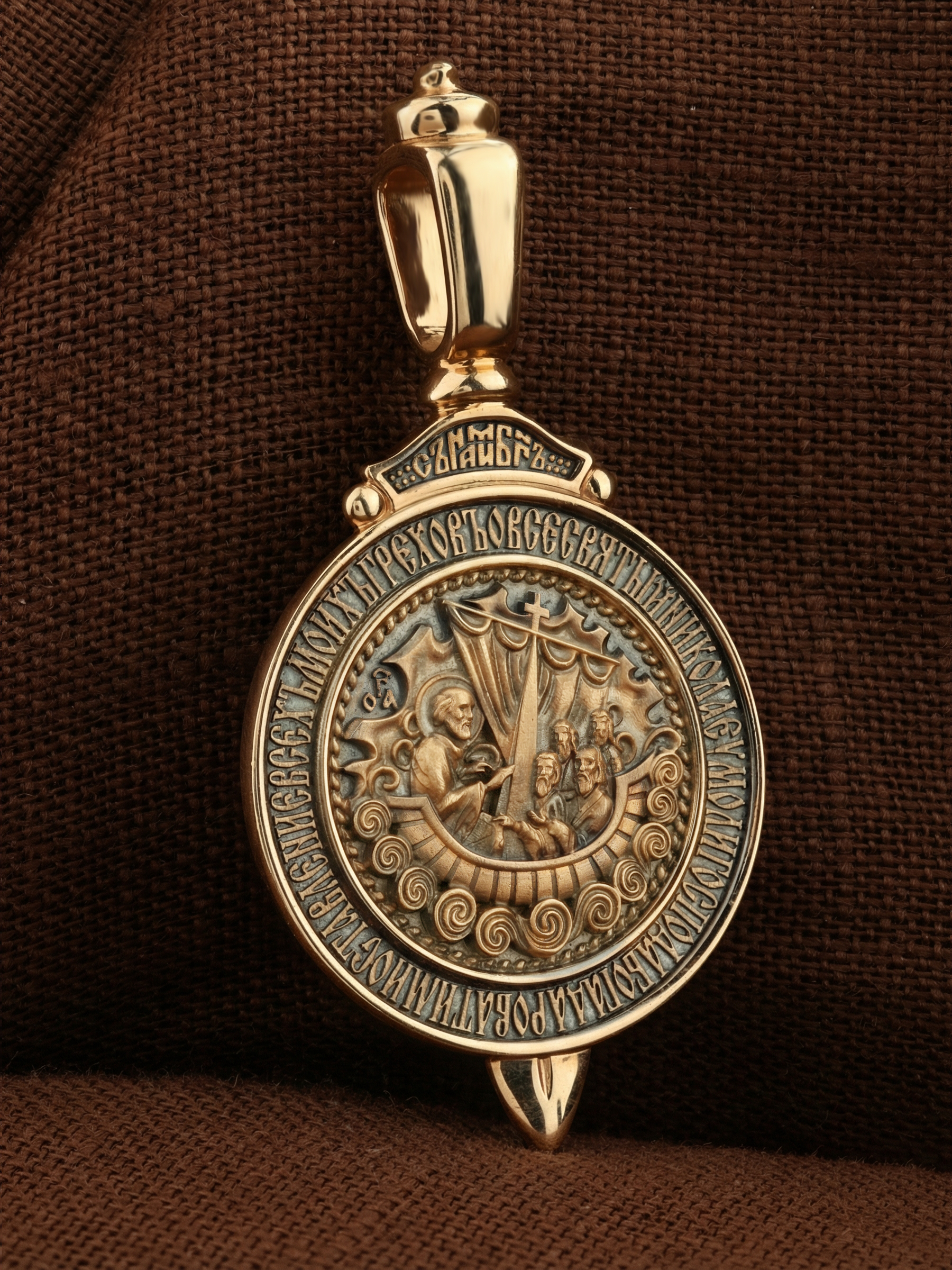 На обороте изображена икона «Чудо спасения трех корабельщиков». Икона рассказывает о том, как погибающие в море купцы обратились за помощью к свт. Николаю и были чудесно им спасены. Сначала они были, как пророк Иона, проглочены рыбой, потом «исплюнуты» ею на поднявшийся из морских пучин камень, а затем на камне, как на корабле, доставлены к городу. Правитель города, узнав о злодействе грабителей-корабельщиков, наказал их и вернул купцам товары. Вокруг — слова молитвы: «О Всесвятый Николае, умоли Господа Бога даровати ми оставление всех моих грехов».